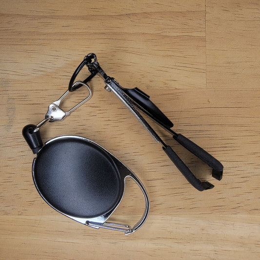Small Tool Retractor with line clipper, eye opener, knot tyer, and hook file