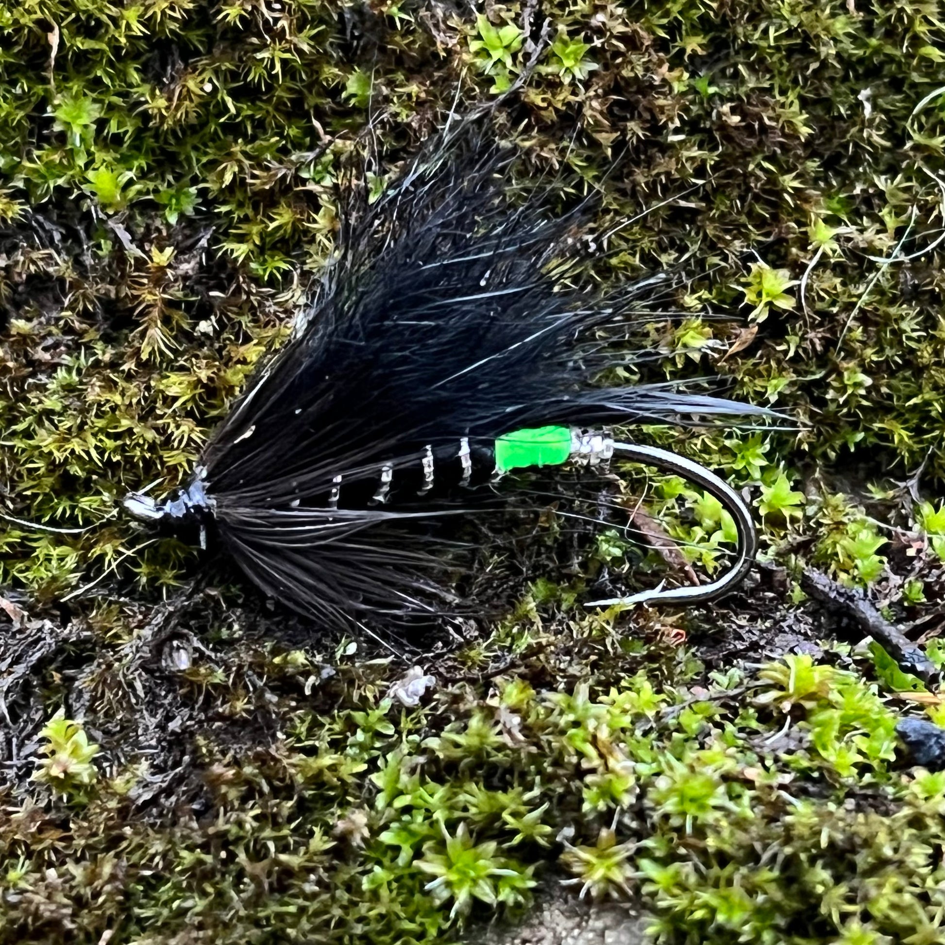 The fly's wing is made from select black hair, chosen for its unique combination of stiffness and mobility. The hair's natural taper and movement create a lifelike action in the water that can simulate a range of prey items from small fish to escaping insects, appealing to the broad diet of the salmon.