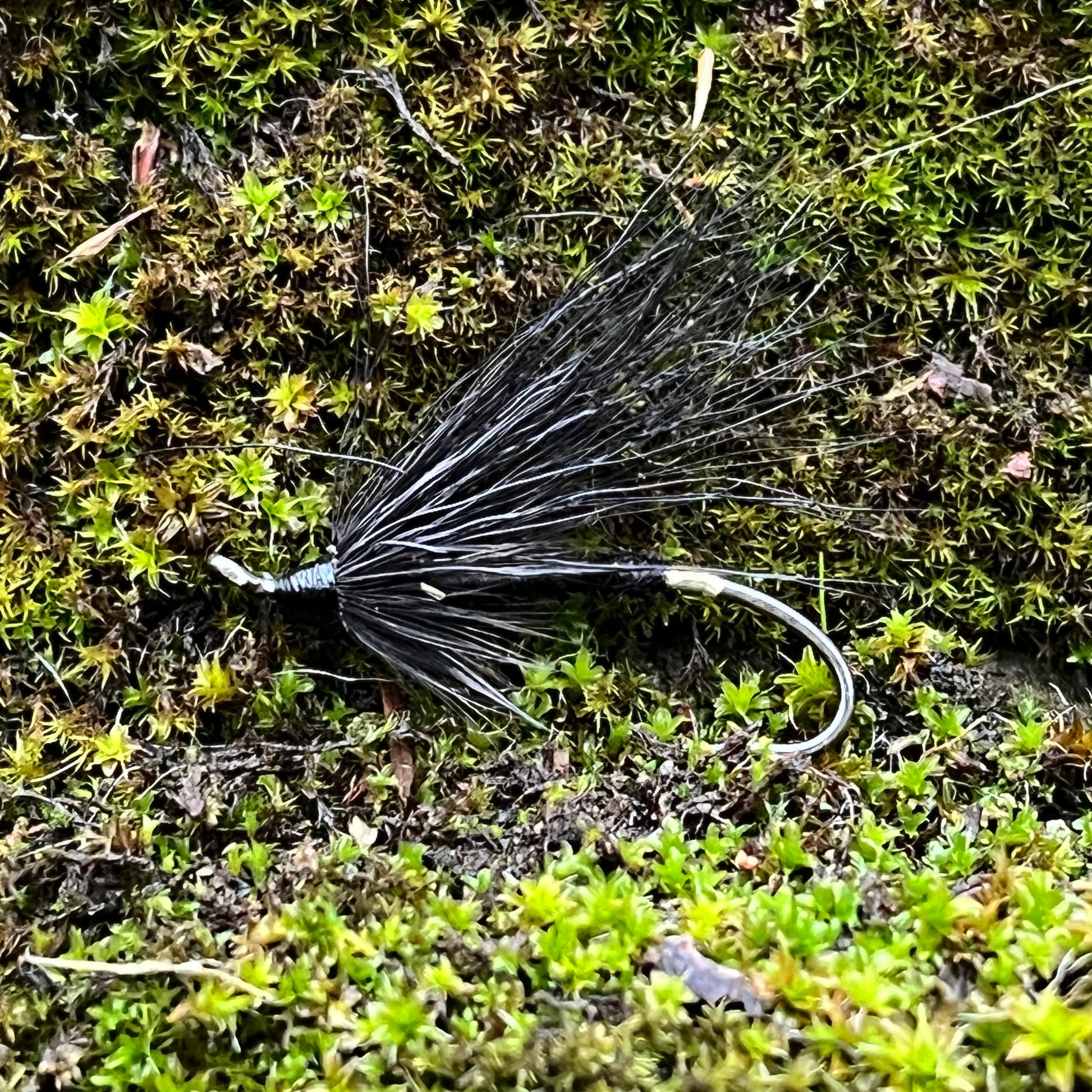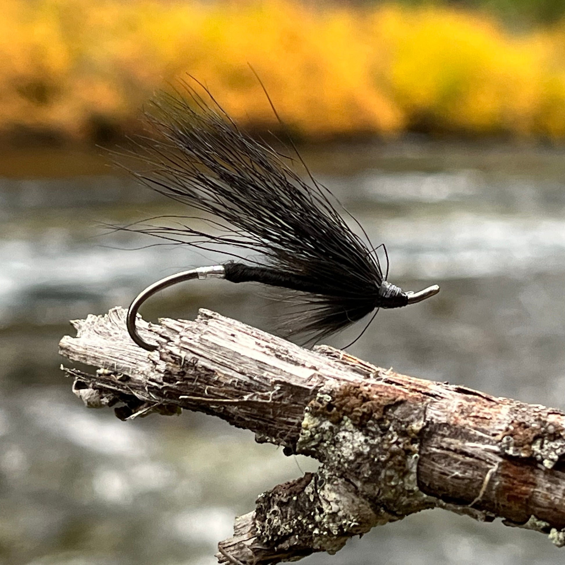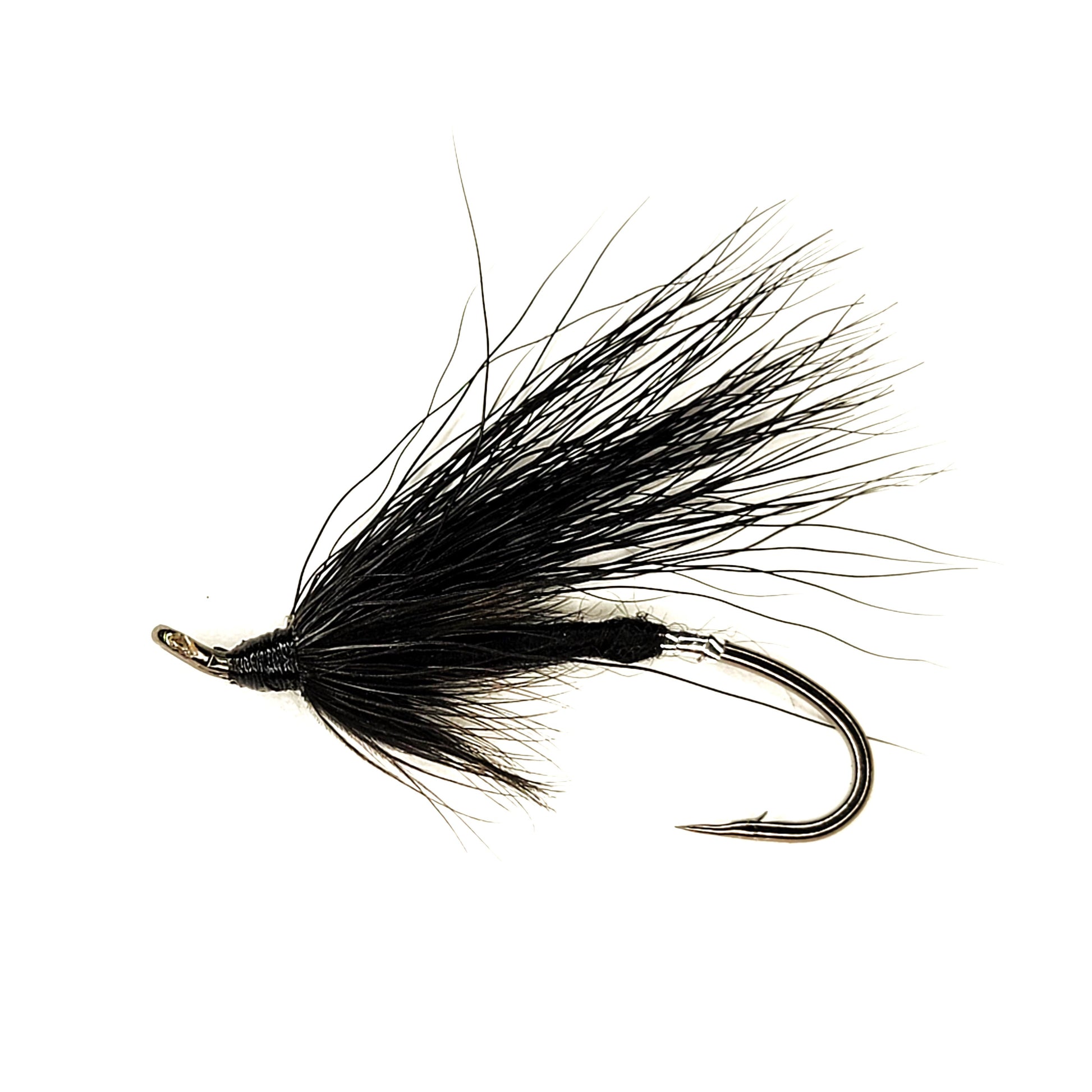 The body of this fly is elegantly wrapped in black floss, creating a slender and unassuming profile that can easily penetrate the depths where salmon often lurk. Black, being a highly visible color against many riverbeds, provides a stark contrast that can be pivotal in murky waters or during times of low light when salmon are on the hunt.