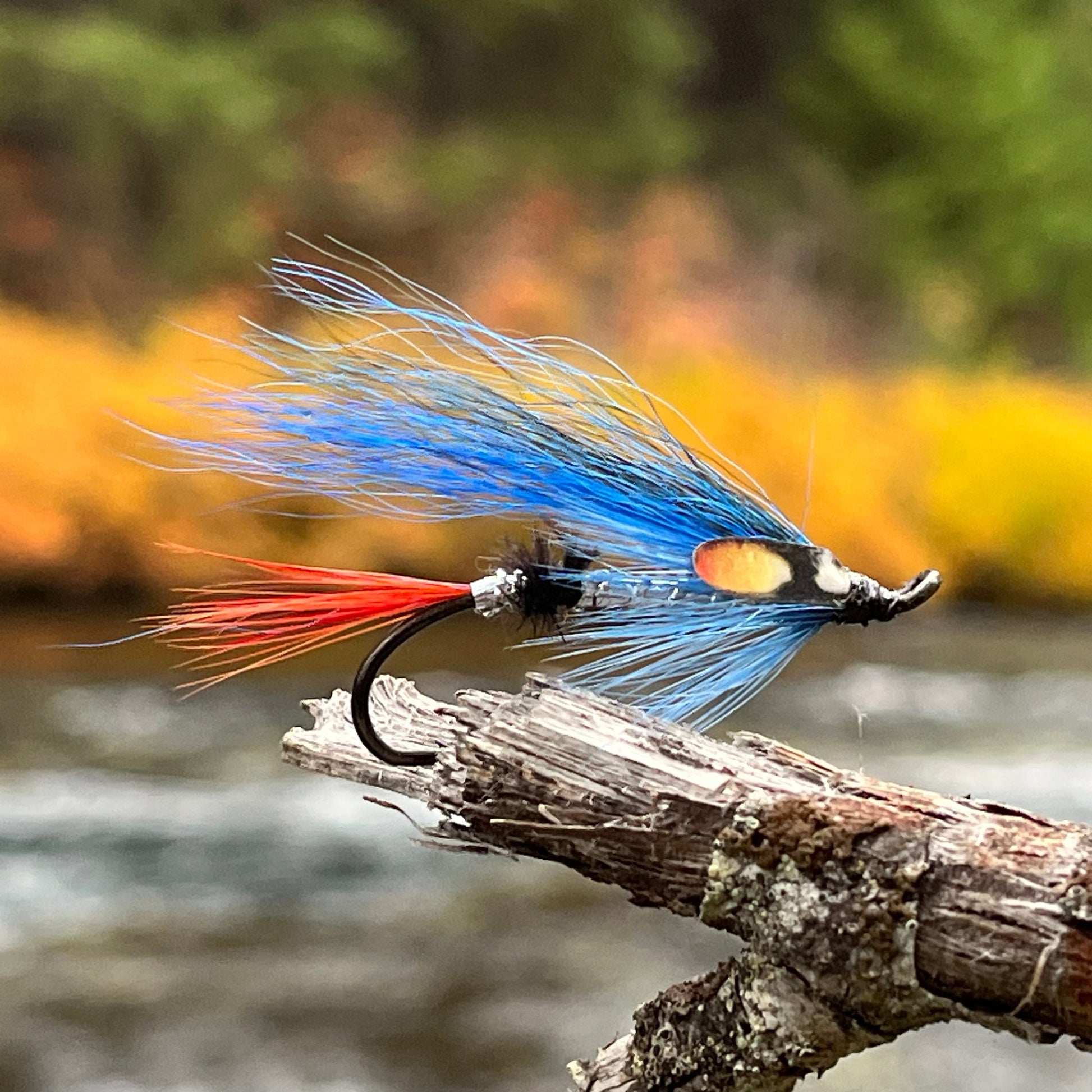 One of the defining characteristics of the "Blue Highlander" is its wing, typically made from vibrant blue hair or feathers. It's carefully tied to lie flat and sleek, offering minimal resistance in the water, which allows for an enticing, lifelike swim. The wing's electric blue shade contrasts beautifully with the yellow body, creating a visual stimulus that salmon find difficult to resist.