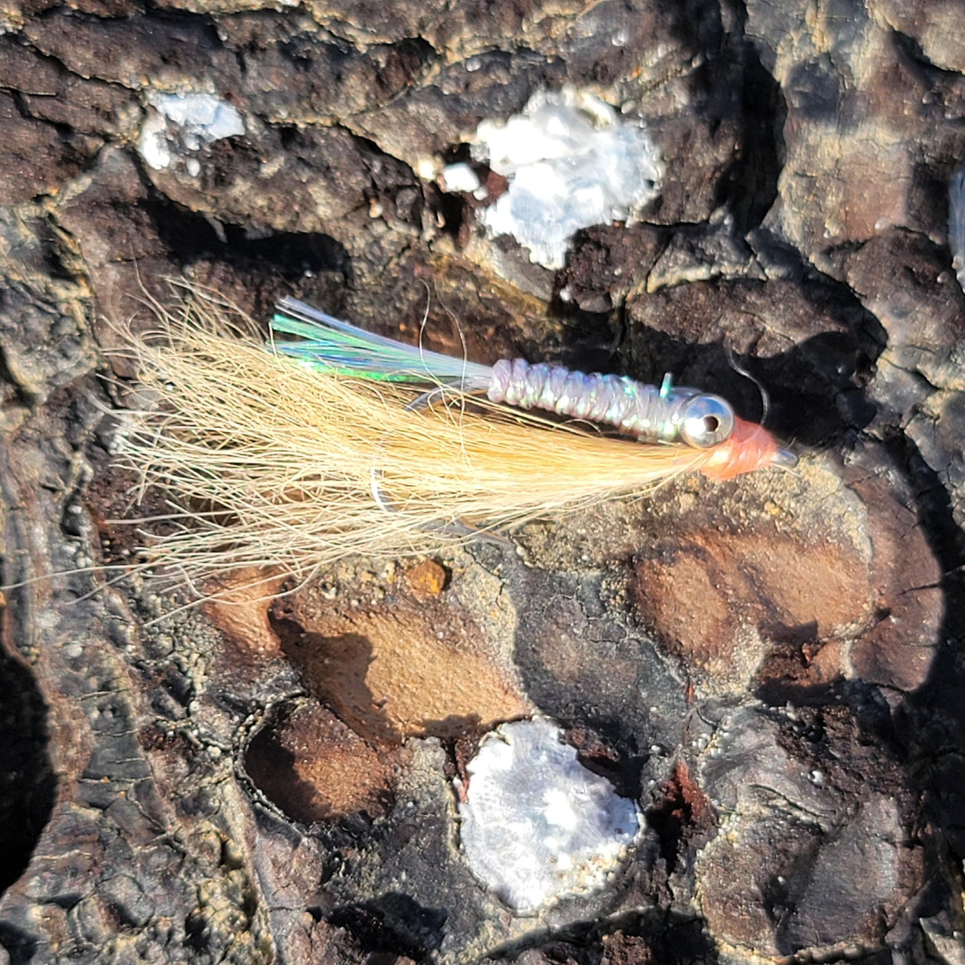 The Bonefish Gotcha features a slender body made of pearl or tan-colored chenille, which imitates the small crustaceans and shrimp that bonefish commonly feed on. The fly also incorporates a pair of bead chain or lead eyes near the front, which helps the fly sink quickly to the desired depth and gives it a realistic downward-angled posture when retrieved.