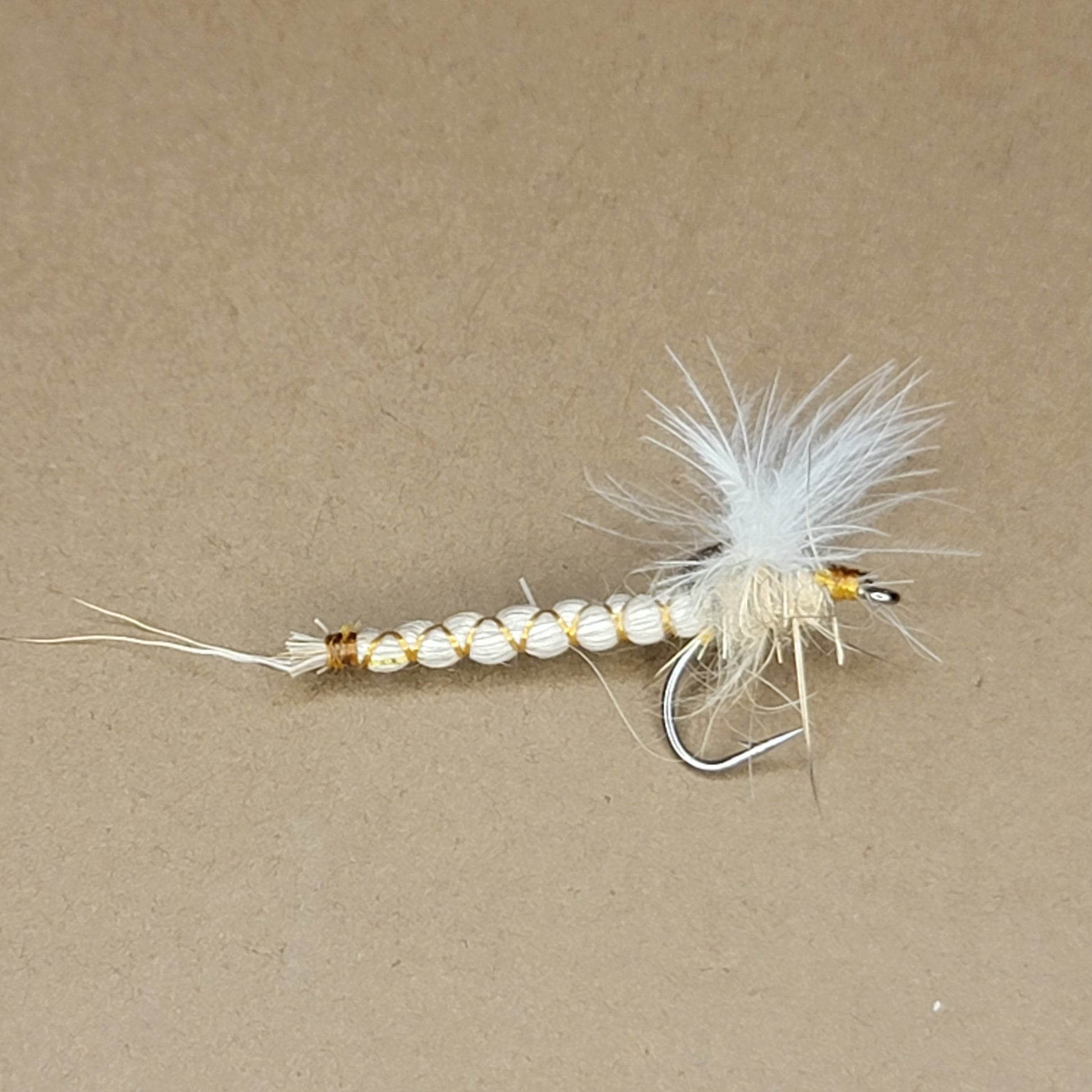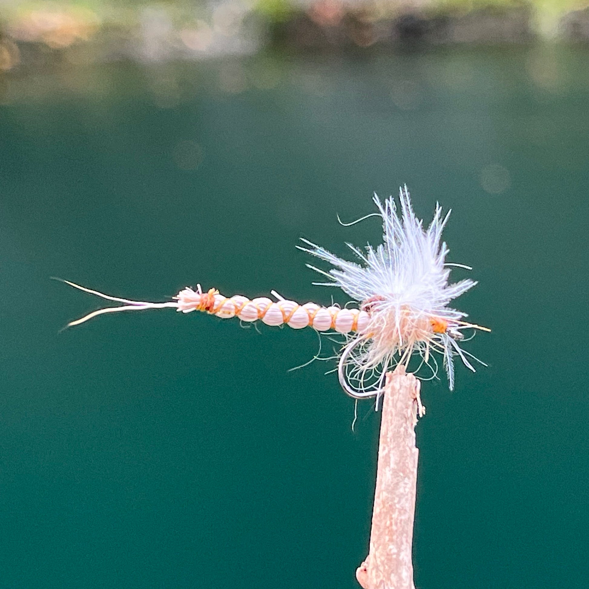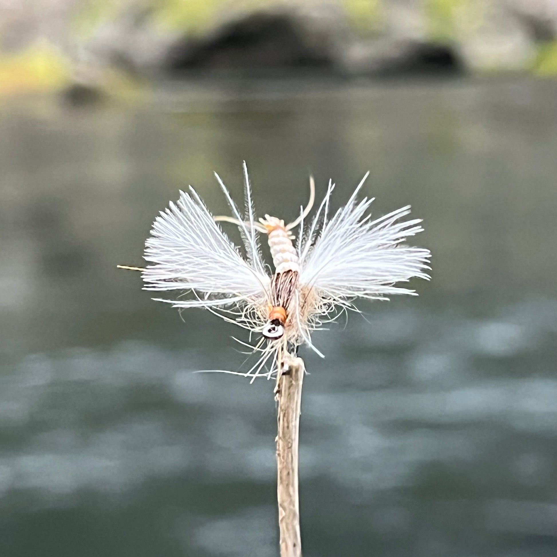 The CDC Mayfly Deer Hair Body typically features a body made from deer hair, which is spun and then trimmed to create a realistic, segmented look. This material is naturally buoyant, helping the fly to float on the water's surface. The wings are made from CDC (Cul de Canard) feathers, which are known for their unique structure that traps air and aids in floatation. These feathers are typically tied in an upright and divided style to mimic the wings of a mayfly dun or spinner. The tail is often made from hackle fibers or other fine feather fibers.