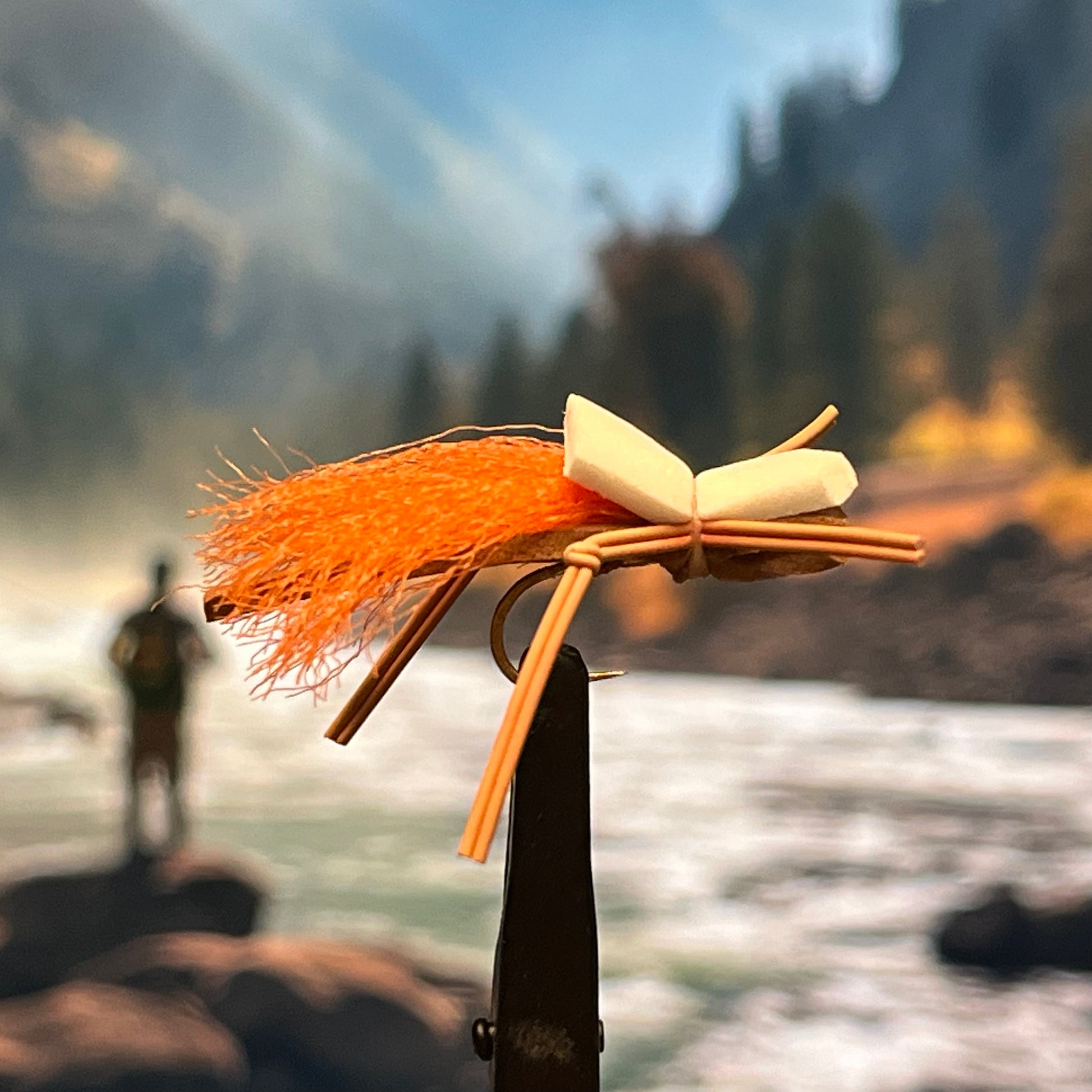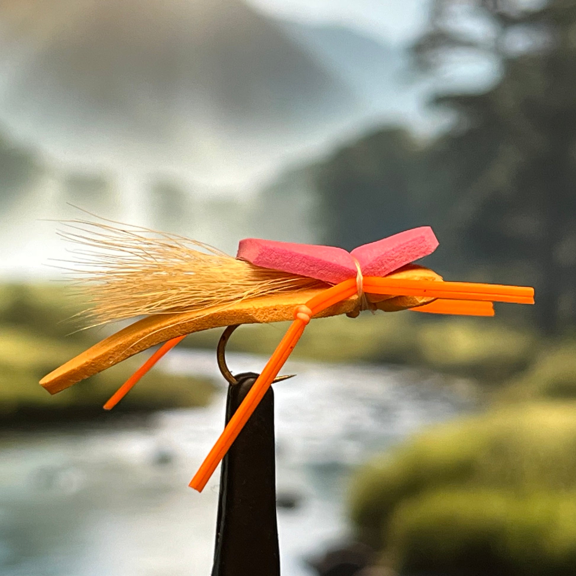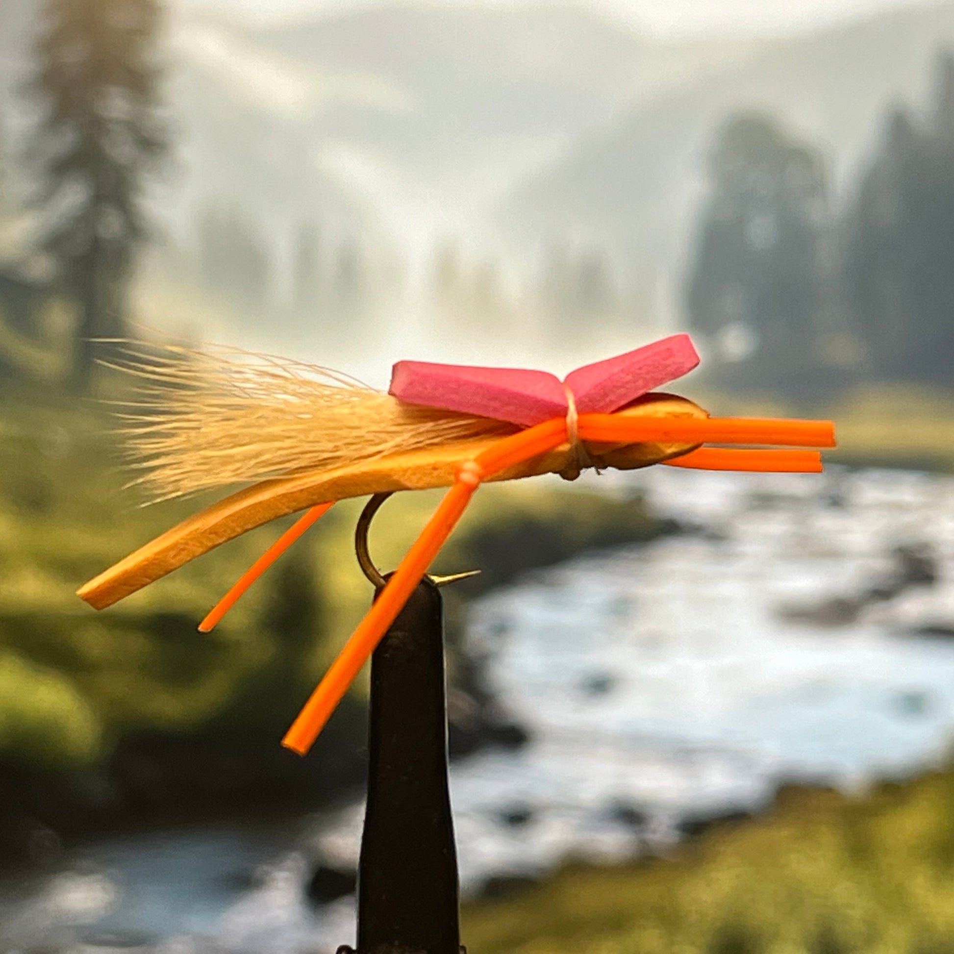 The Chaos Hopper is fished as a skittering grasshopper imitation across current seams and near the banks. The deer hair wing and stiff legs give it an erratic action that suggests an injured insect.