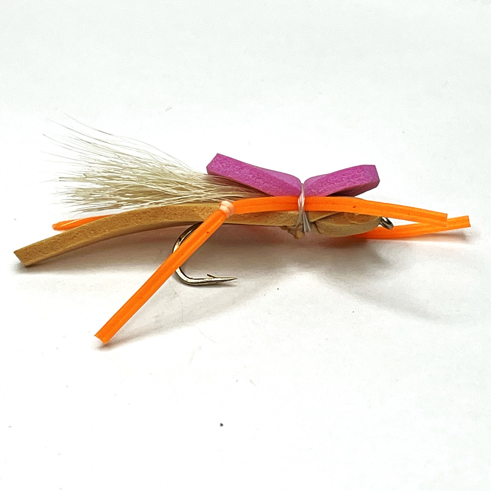 It features a realistic grasshopper profile made of closed-cell foam, with a bright colored underbody and natural tan overbody. Stiff polypropylene legs extend out from the sides, while a deer hair wing provides visibility.
