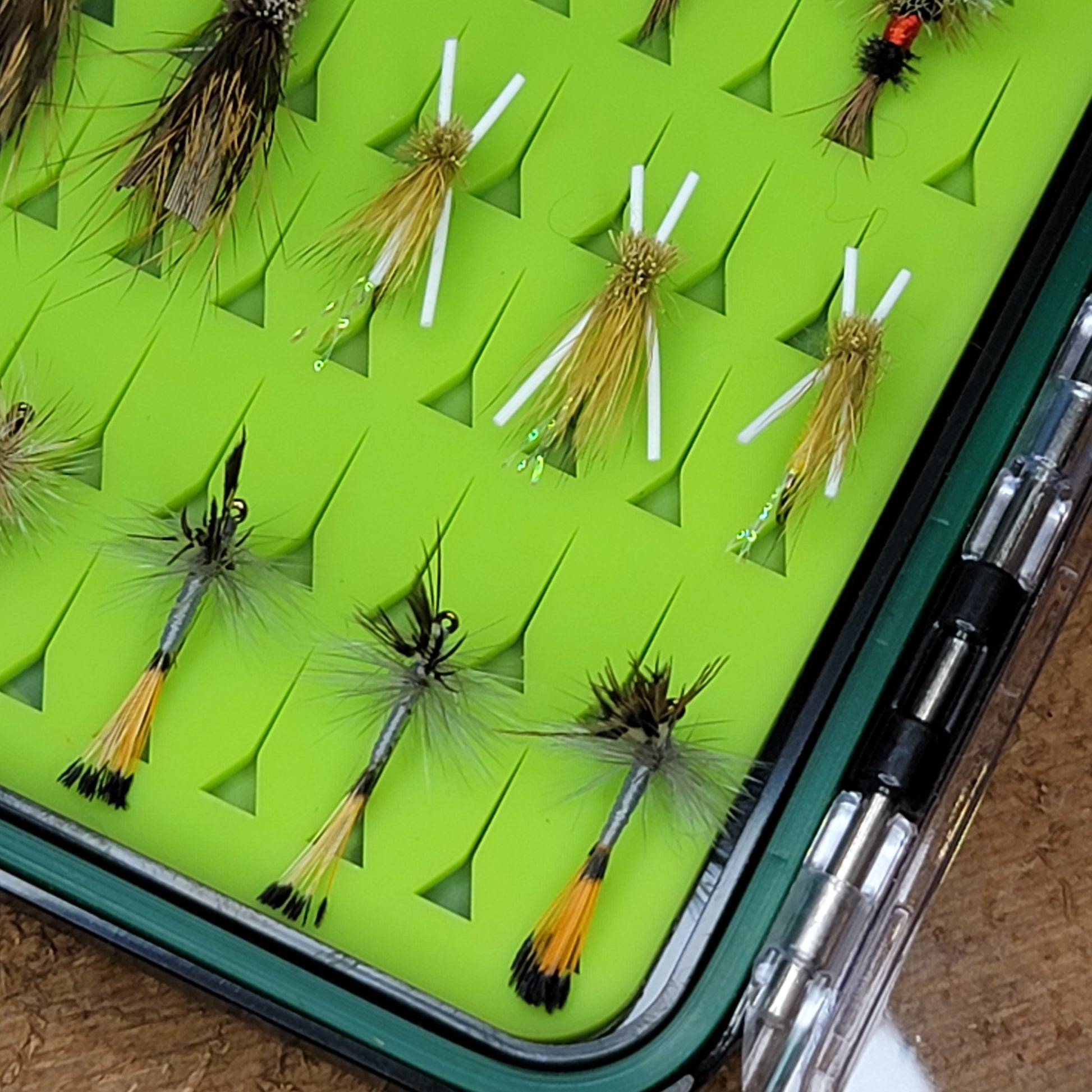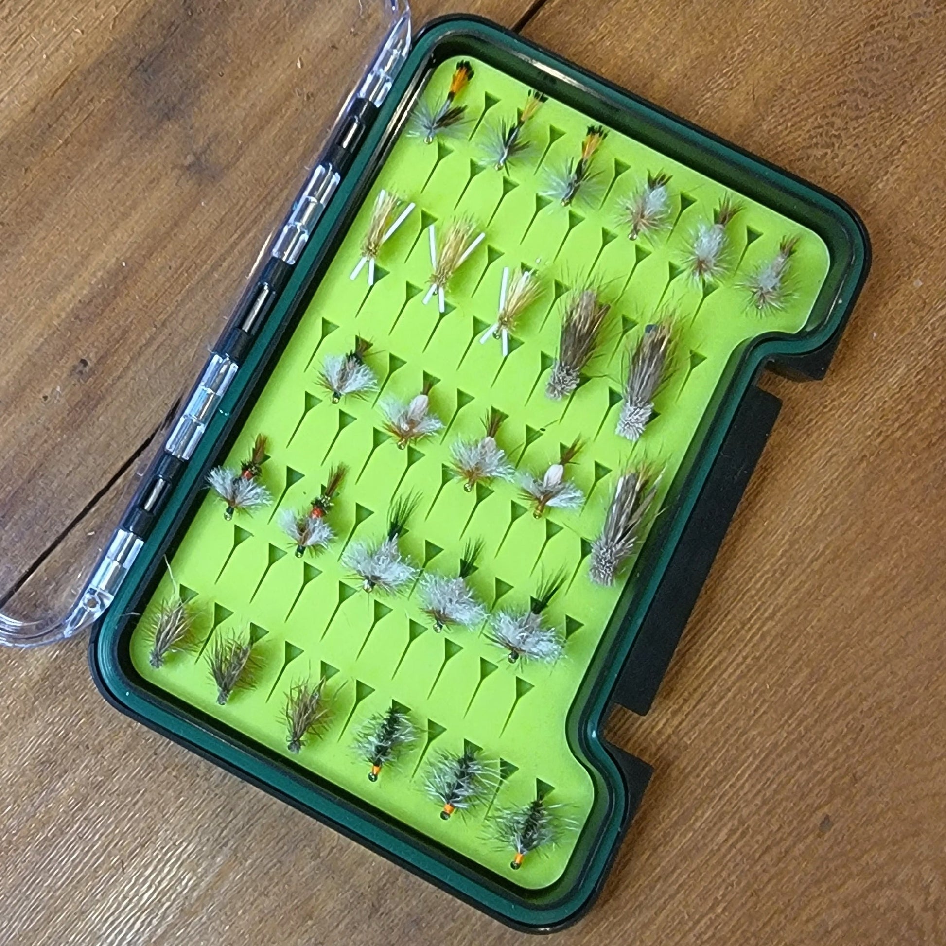 This selection of 27 dry flies comes with a durable ABS case with clear lid and a silicon fly pad.