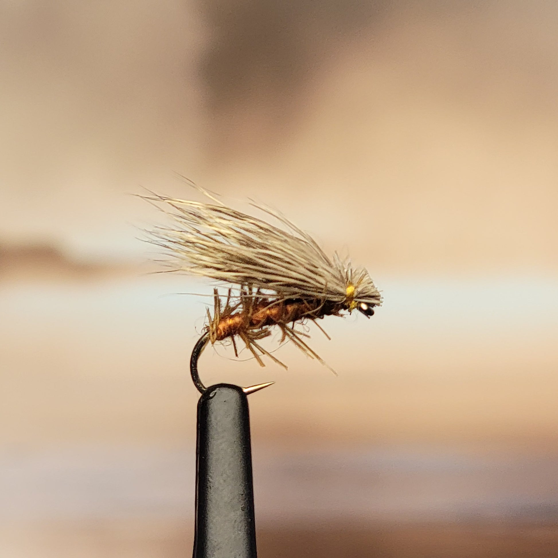Wing: The wing is the most distinctive feature of this fly. It is made from a clump of deer hair that is tied onto the hook and then clipped into a triangular or tent-like shape. This gives the fly its characteristic caddisfly silhouette when seen from above. The color of the wing can vary but it's often left in its natural deer hair color.