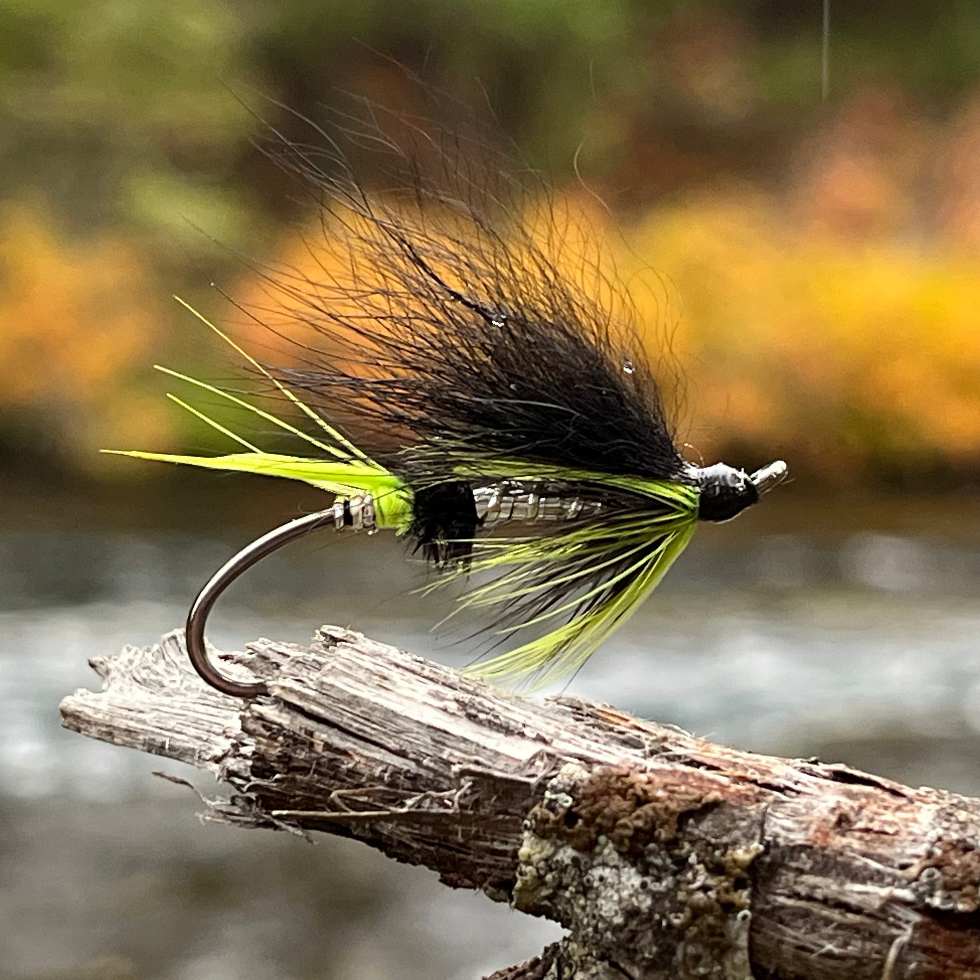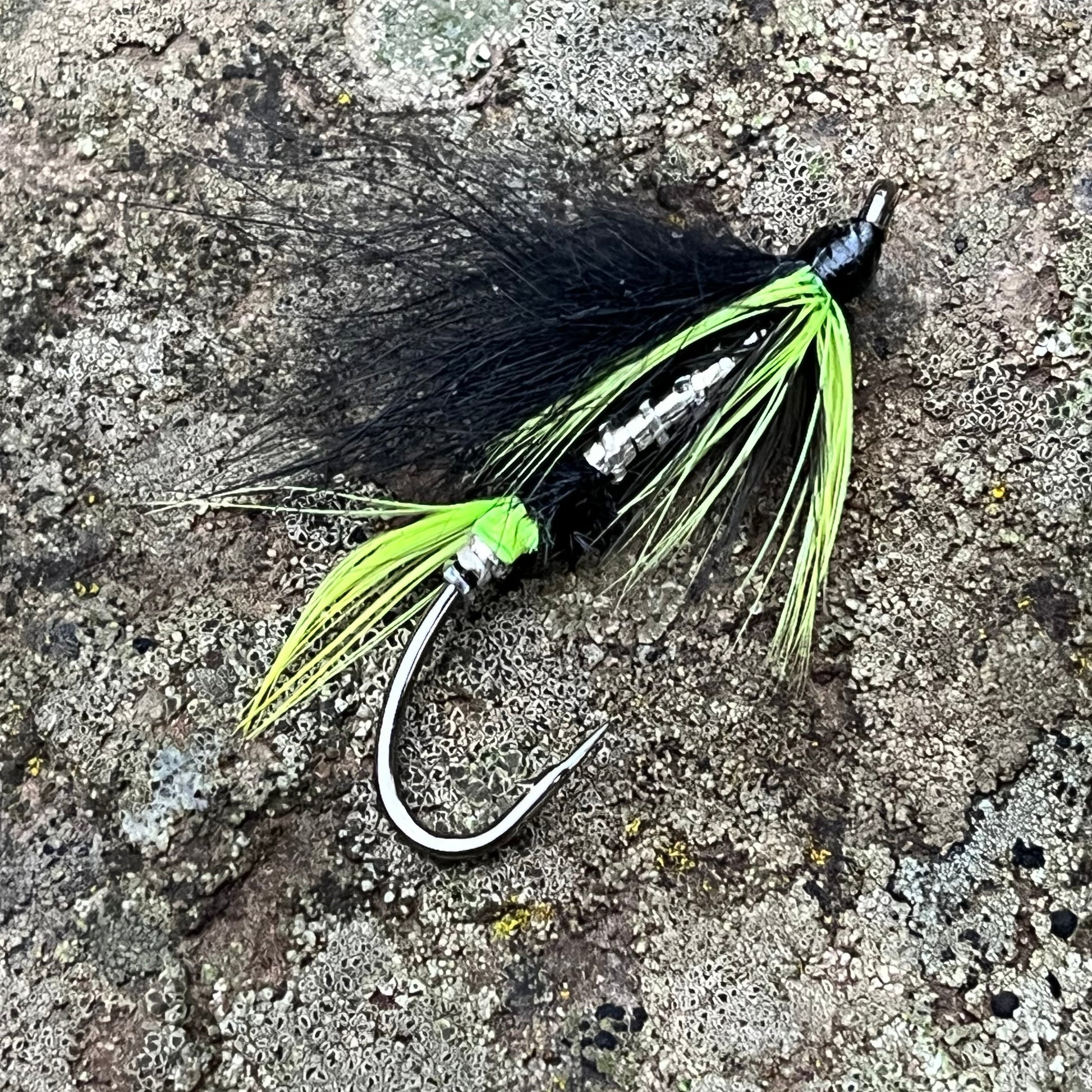 The El Tigre Salmon Fly, size #4, is a striking and effective fly pattern that has been meticulously designed to target salmon with its alluring blend of color, sparkle, and movement. This fly is a beacon in the water, catching the light and the eyes of salmon with its shimmering presence.