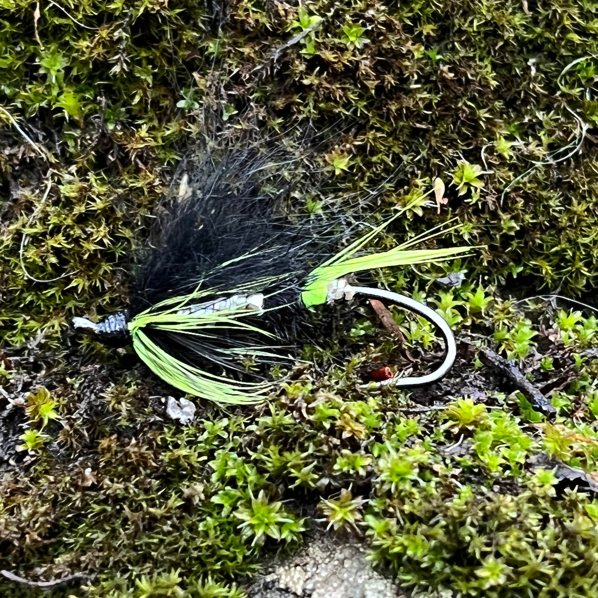 Completing the fly is the head, meticulously wrapped with black thread to complement the overall color scheme and then finished with a glossy coat of varnish. This head not only secures all elements of the fly but also adds another point of reflection that can catch the light and draw attention.