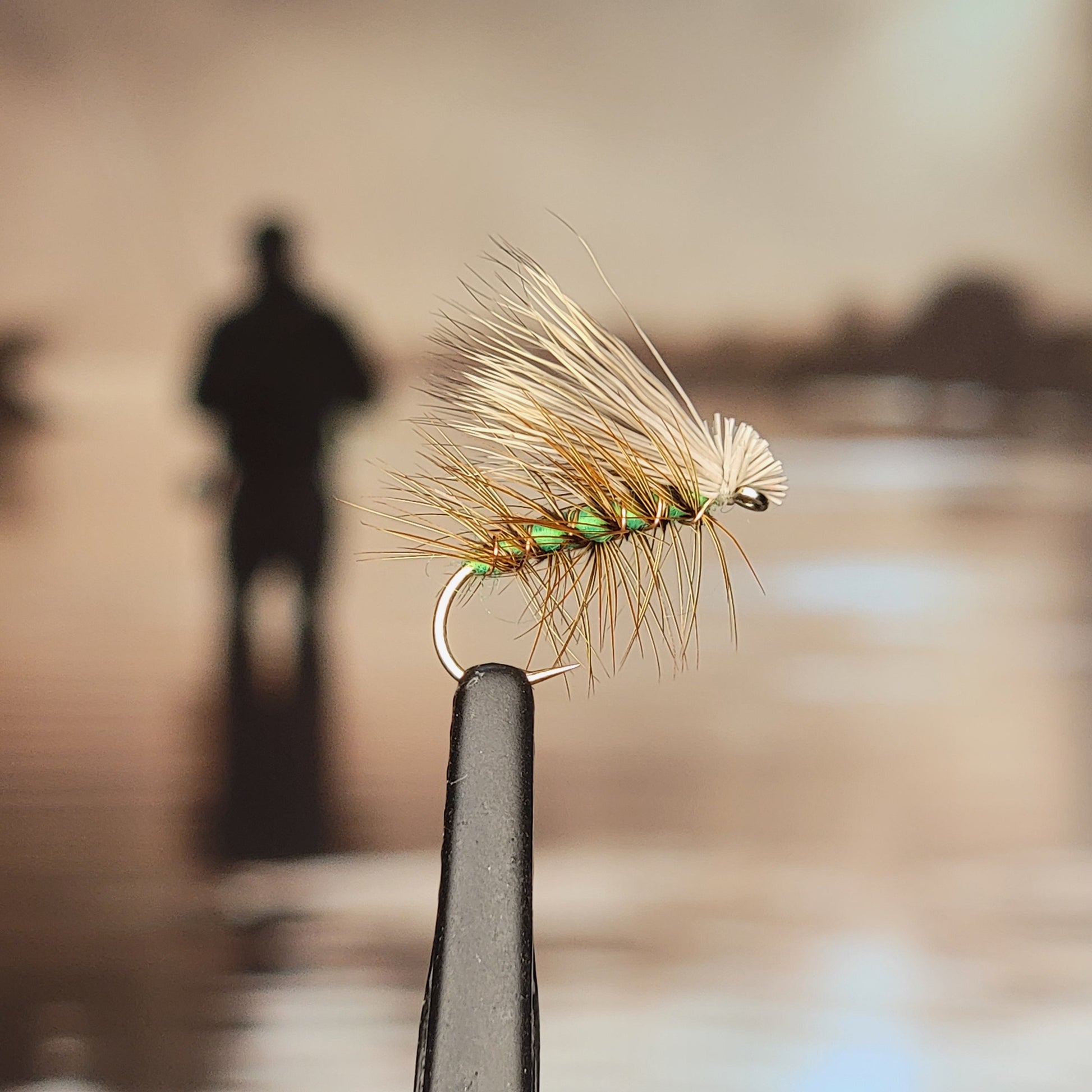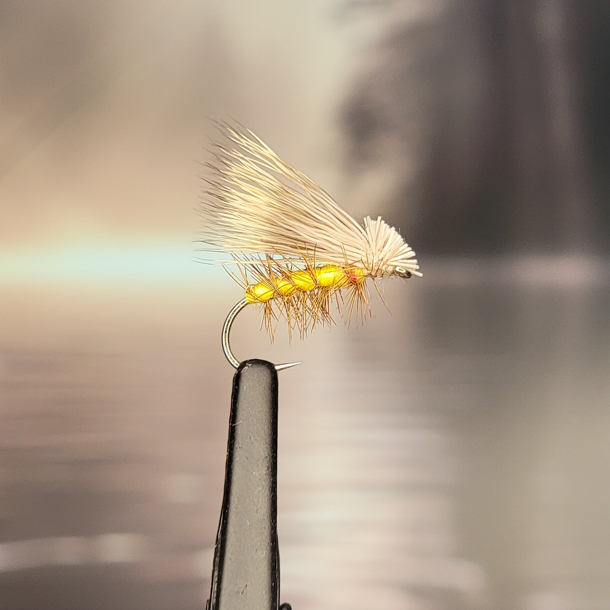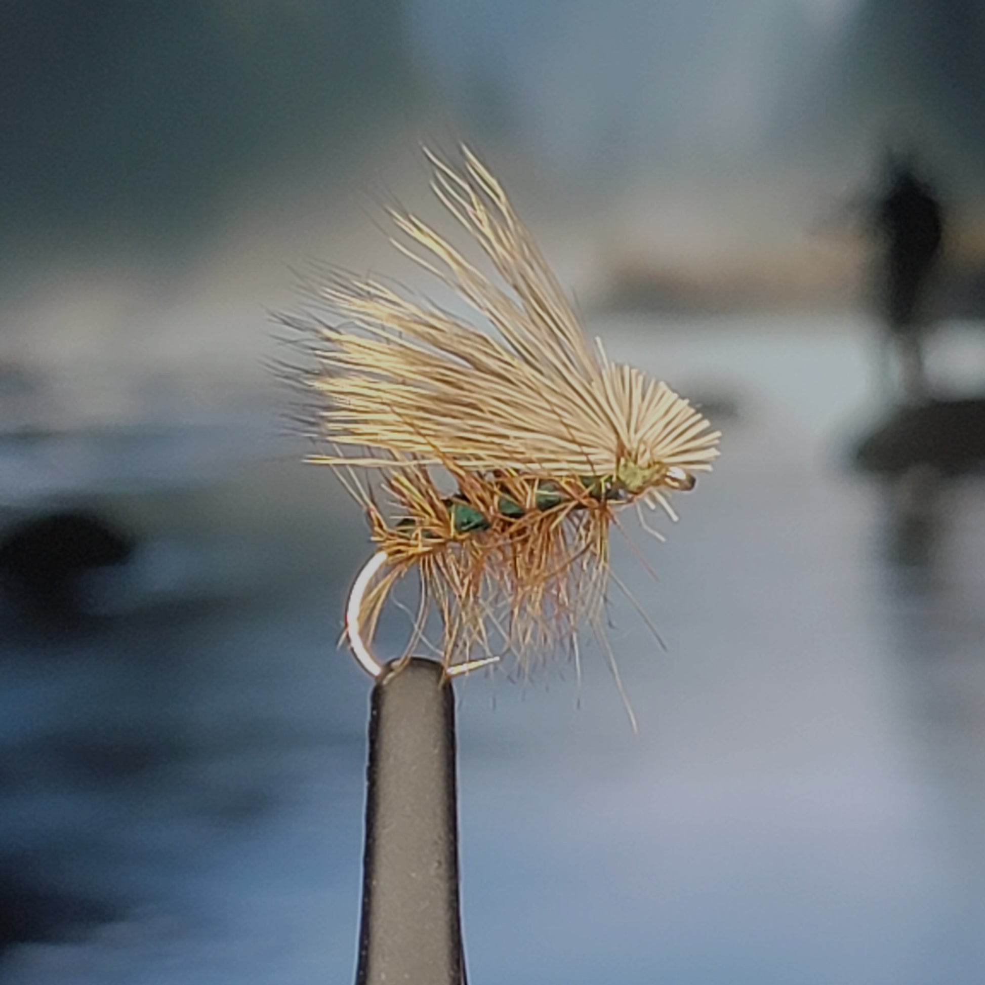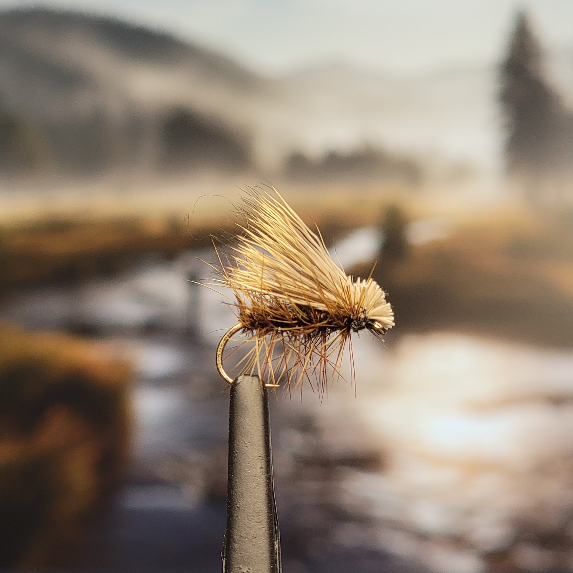 The Elk Hair Caddis is a popular and effective dry fly used to imitate adult caddisflies, which are a common food source for trout and other freshwater fish. This fly floats well due to the natural buoyancy of the elk hair and is often used in fast-moving streams. Here's a detailed description of the Elk Hair Caddis fly: