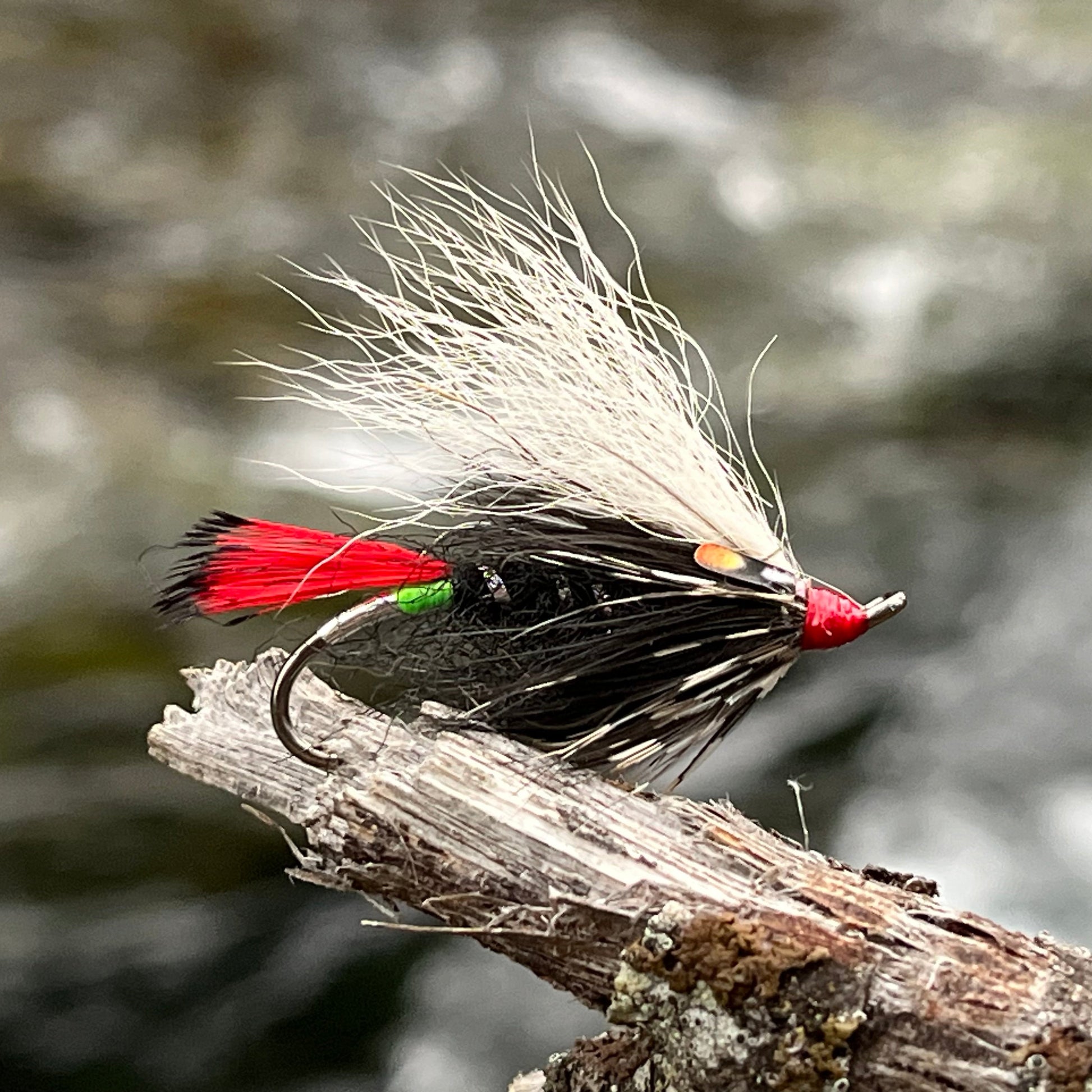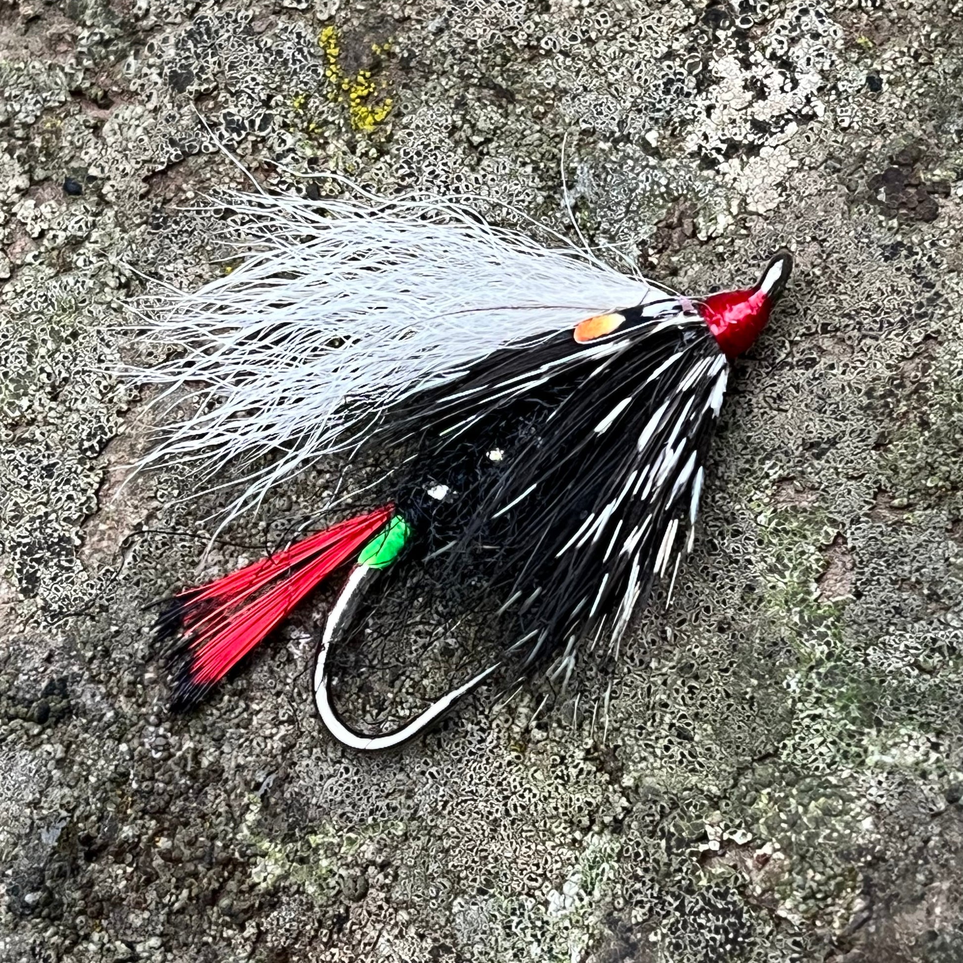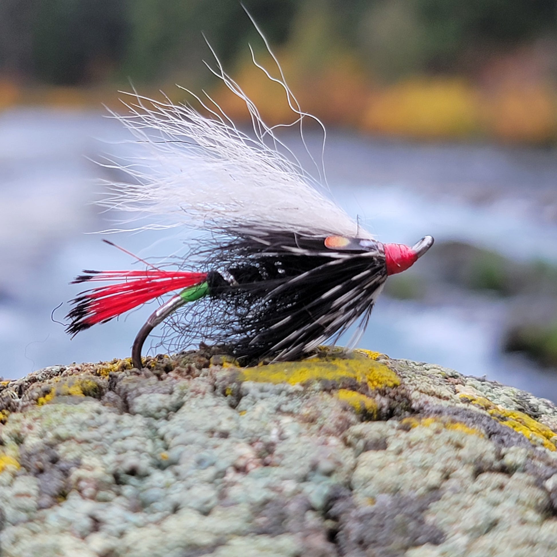 Collaring the fly is a soft hackle, in black and white, which pulsates in the current to simulate life. The hackle helps to balance the fly in the water and adds to the overall buggy appearance that can be irresistible to salmon.