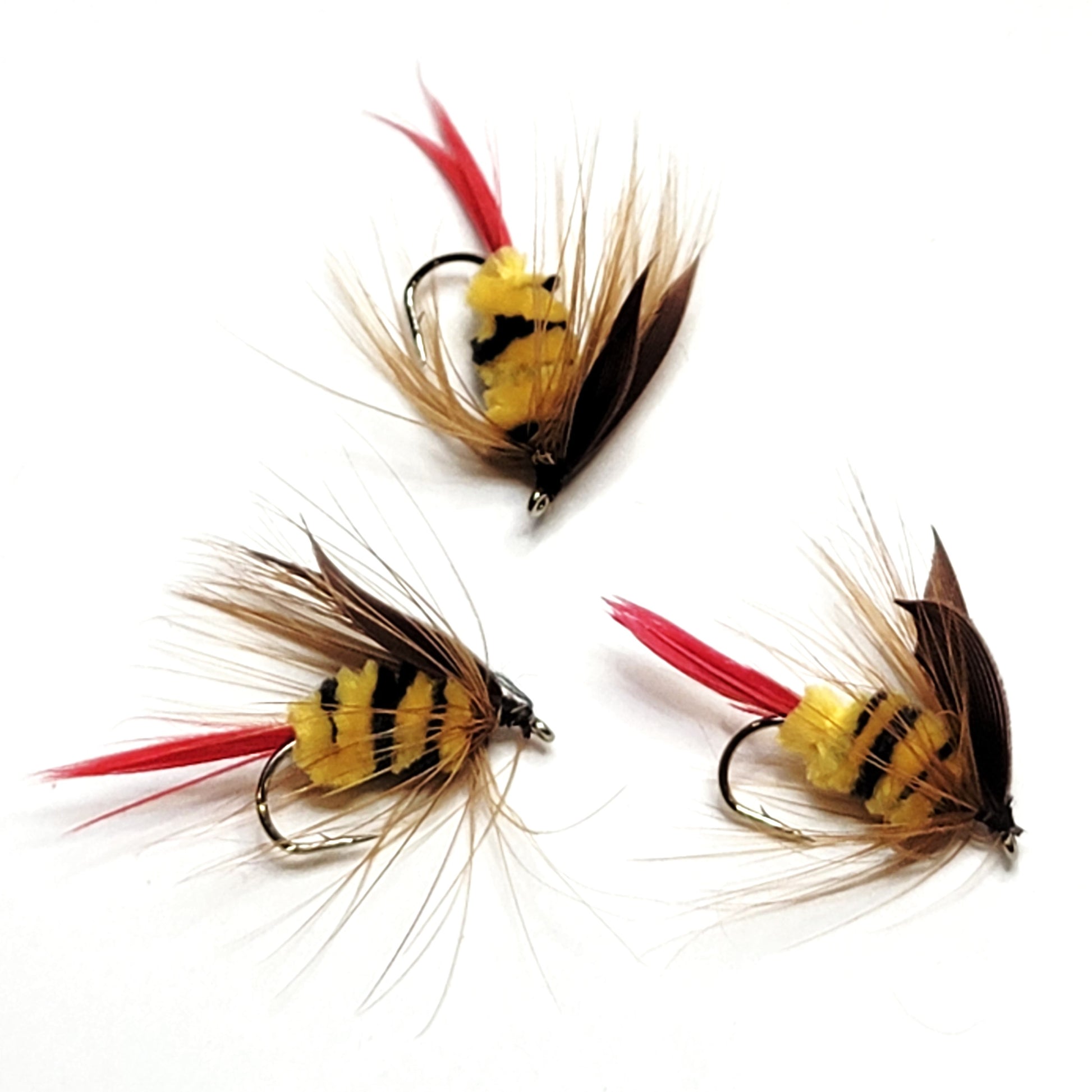 Although the size can vary from 10 to 16 depending on the specific fishing needs. It features a black and yellow striped pattern on its body, which is intended to replicate the vibrant colors of a bumblebee. This pattern is achieved using alternating bands of black and yellow chenille.