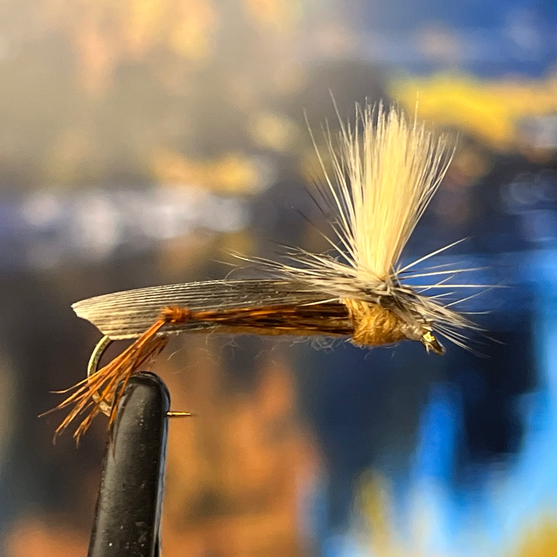 Tied with buoyant foam that suspends lightly on the surface, tempting fish to strike. The brown body and white parachute post match common hopper species.