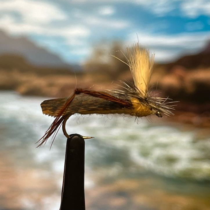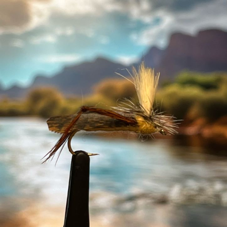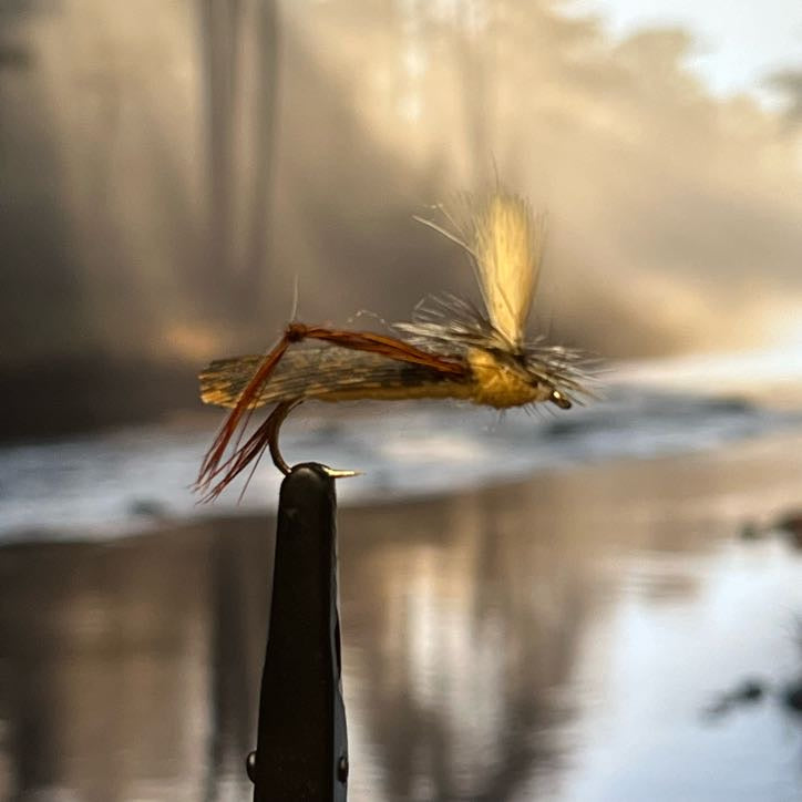 The Parachute Hopper accurately imitates grasshoppers that get blown onto the water. Its realistic silhouette and coloring are irresistible to opportunistic trout.