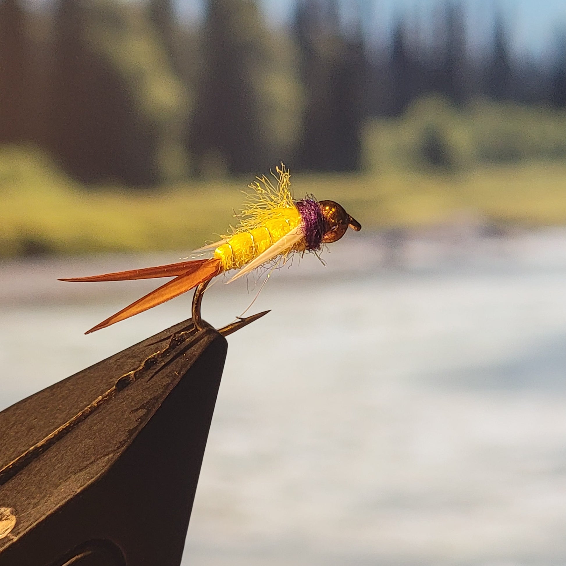The Psycho Prince Nymph fly is an attractor nymph, featuring an amalgam of diverse materials to create an impressionistic look. It is tied on a hook with a gold brass bead and is available in various sizes, ranging from #10 to #16.