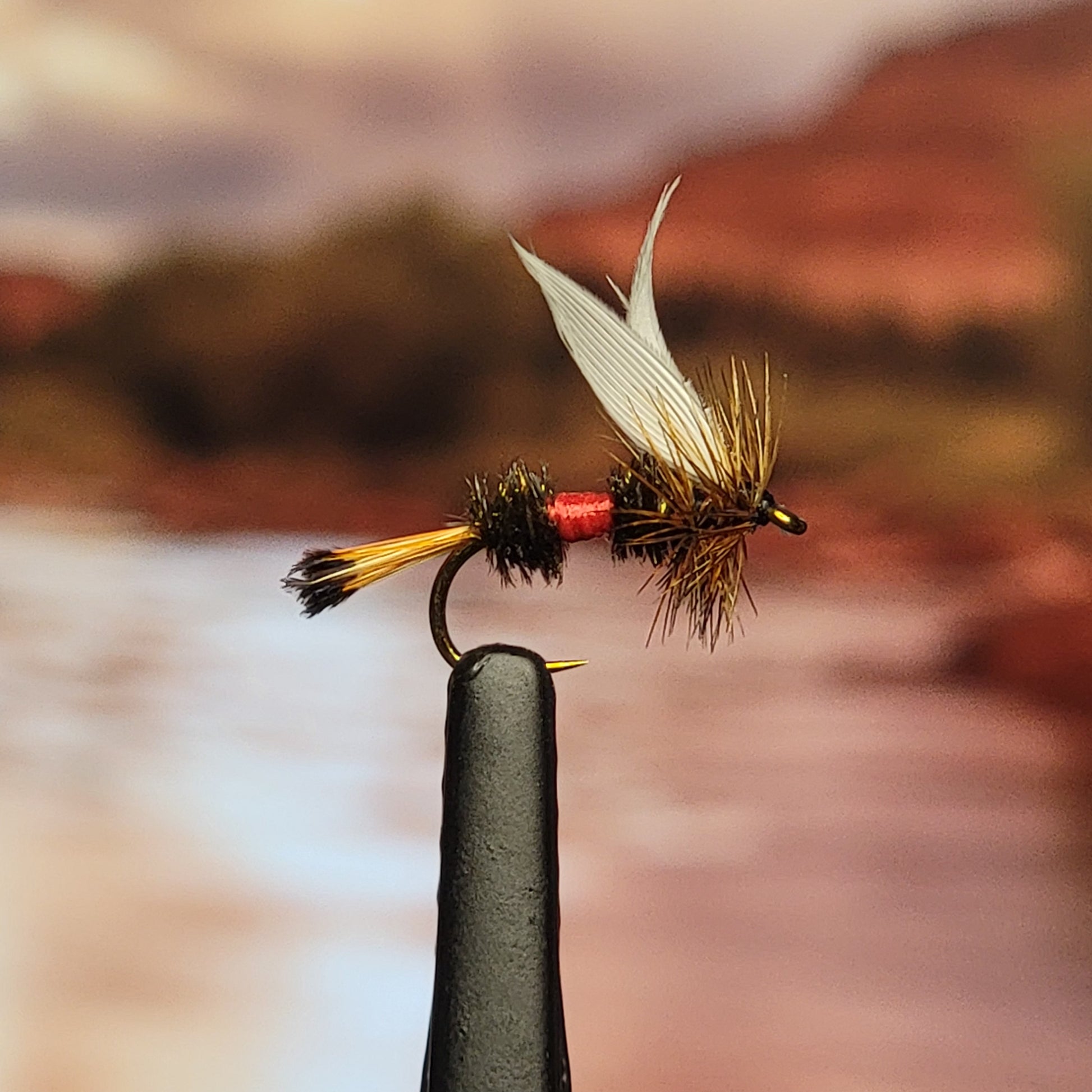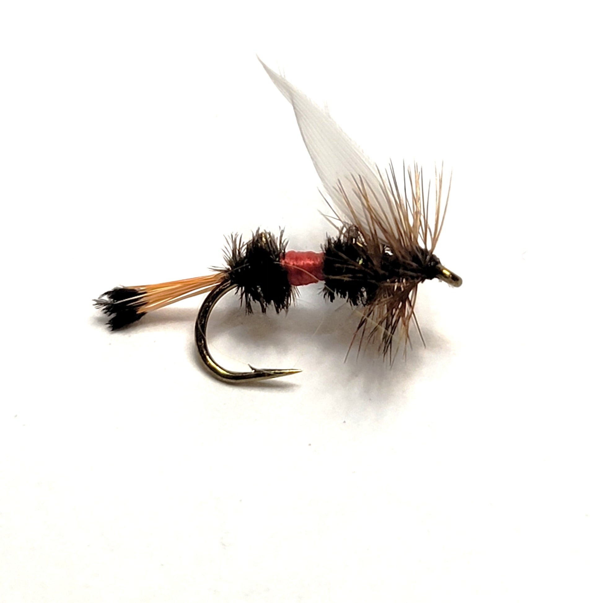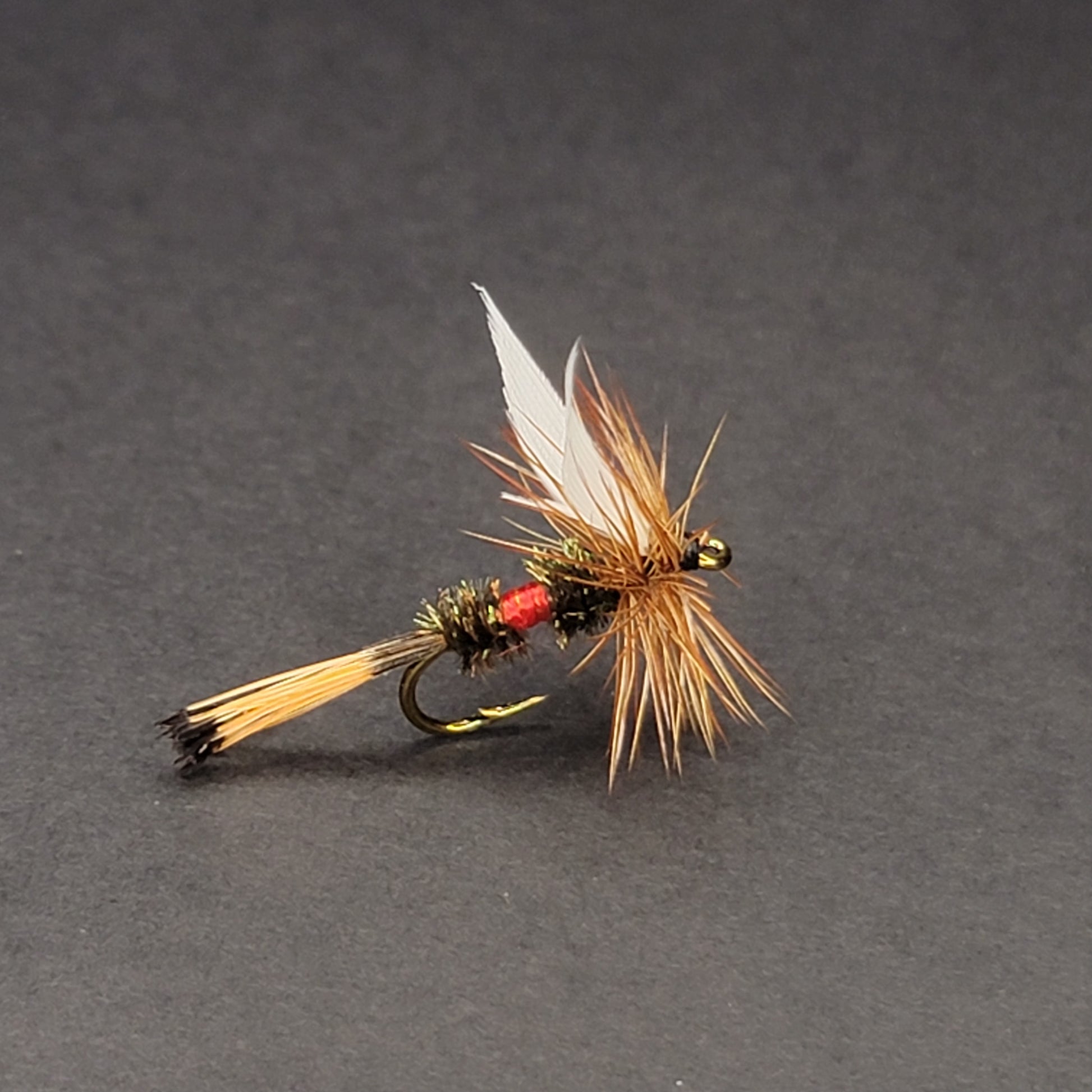 The hackle is usually brown or grizzly in color and is wrapped around the hook shank behind and in front of the wings.