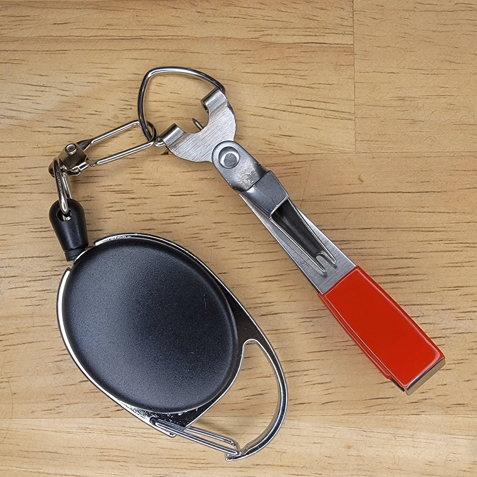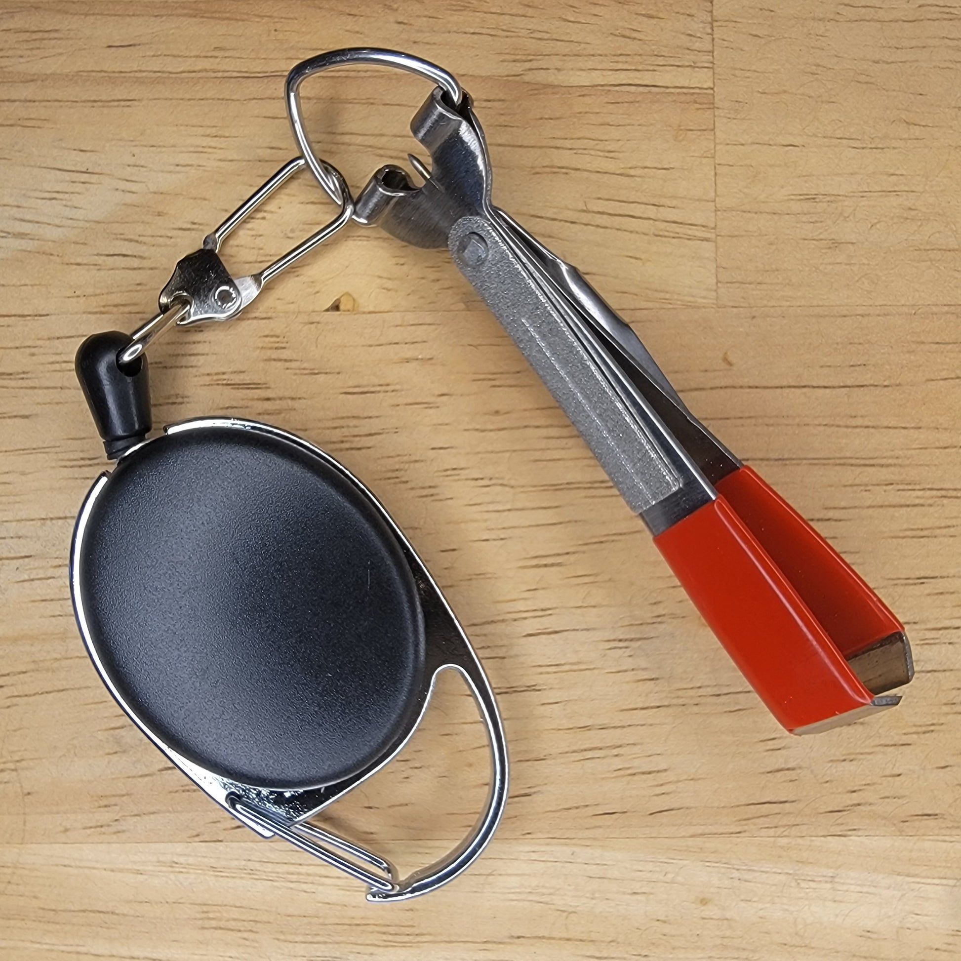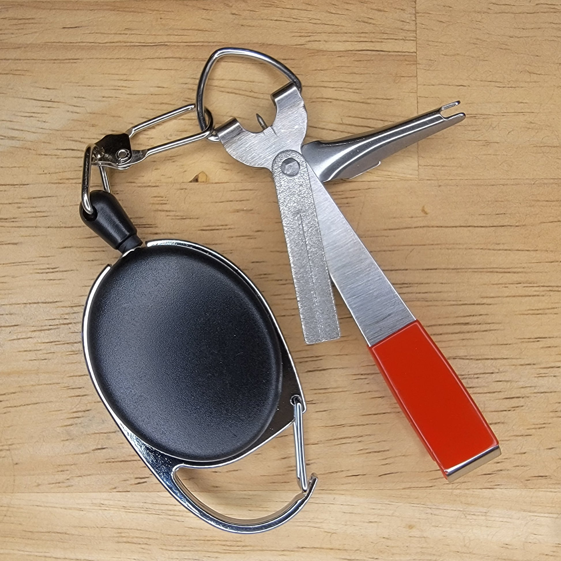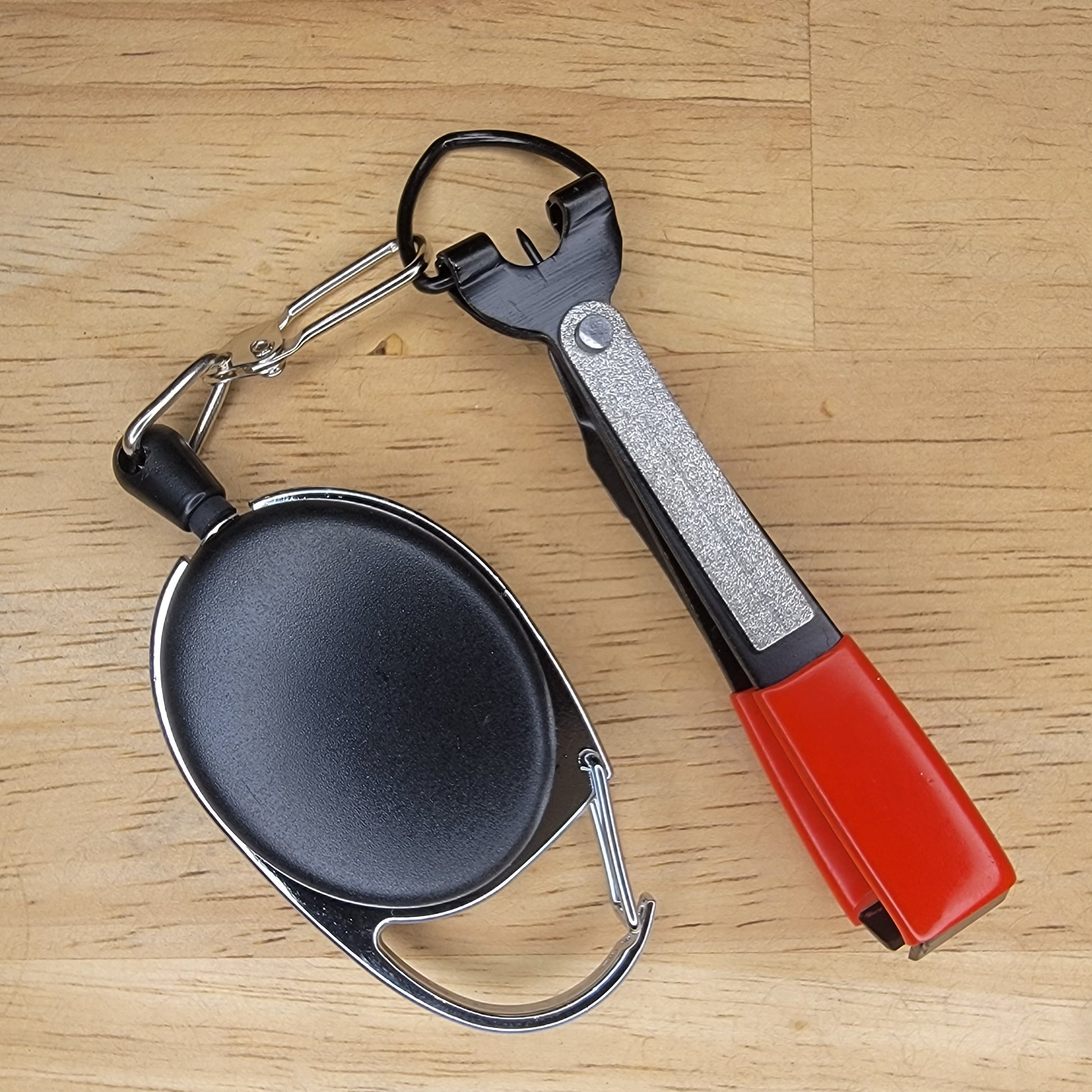 Small Tool Retractor with line clipper, eye opener, knot tyer, and hook file