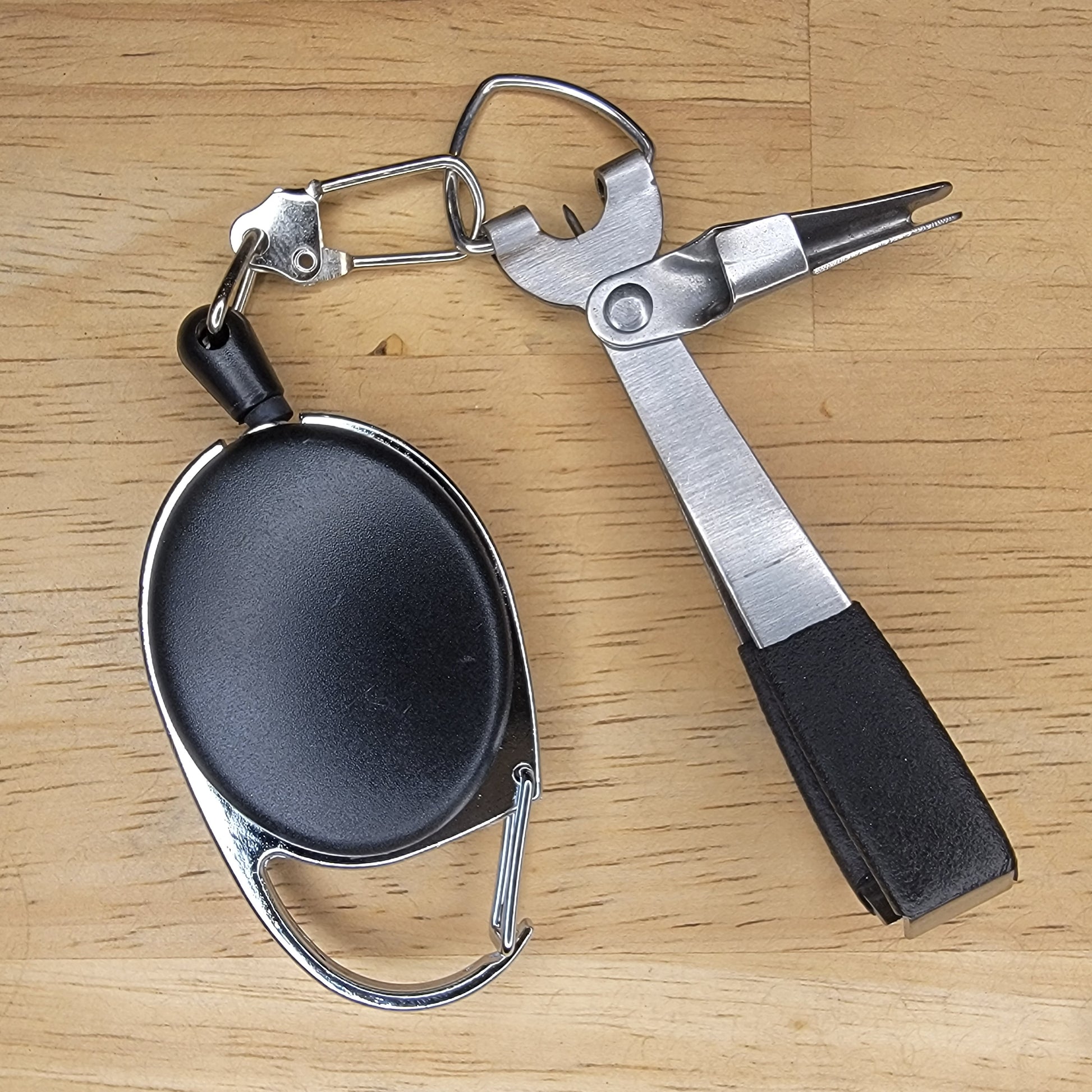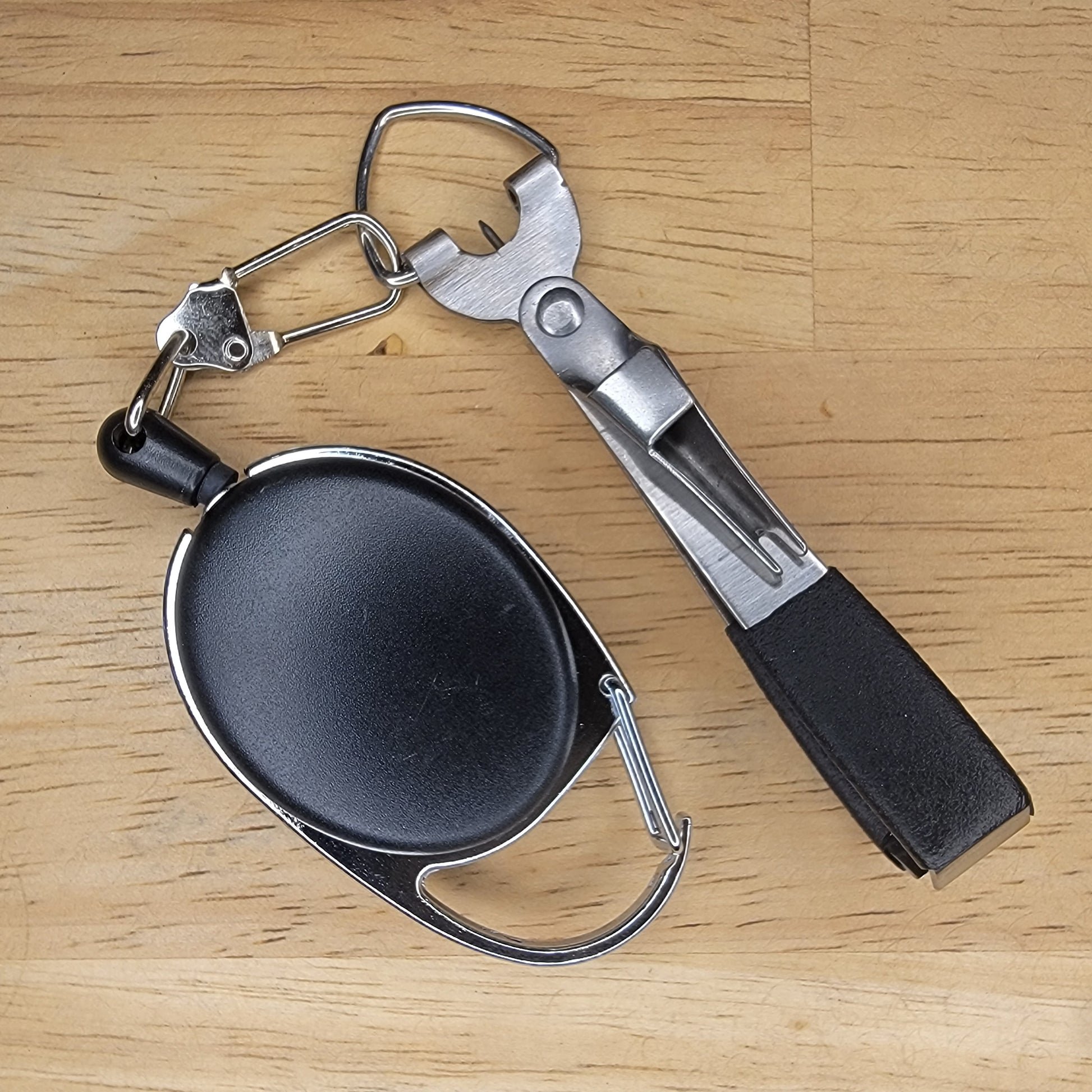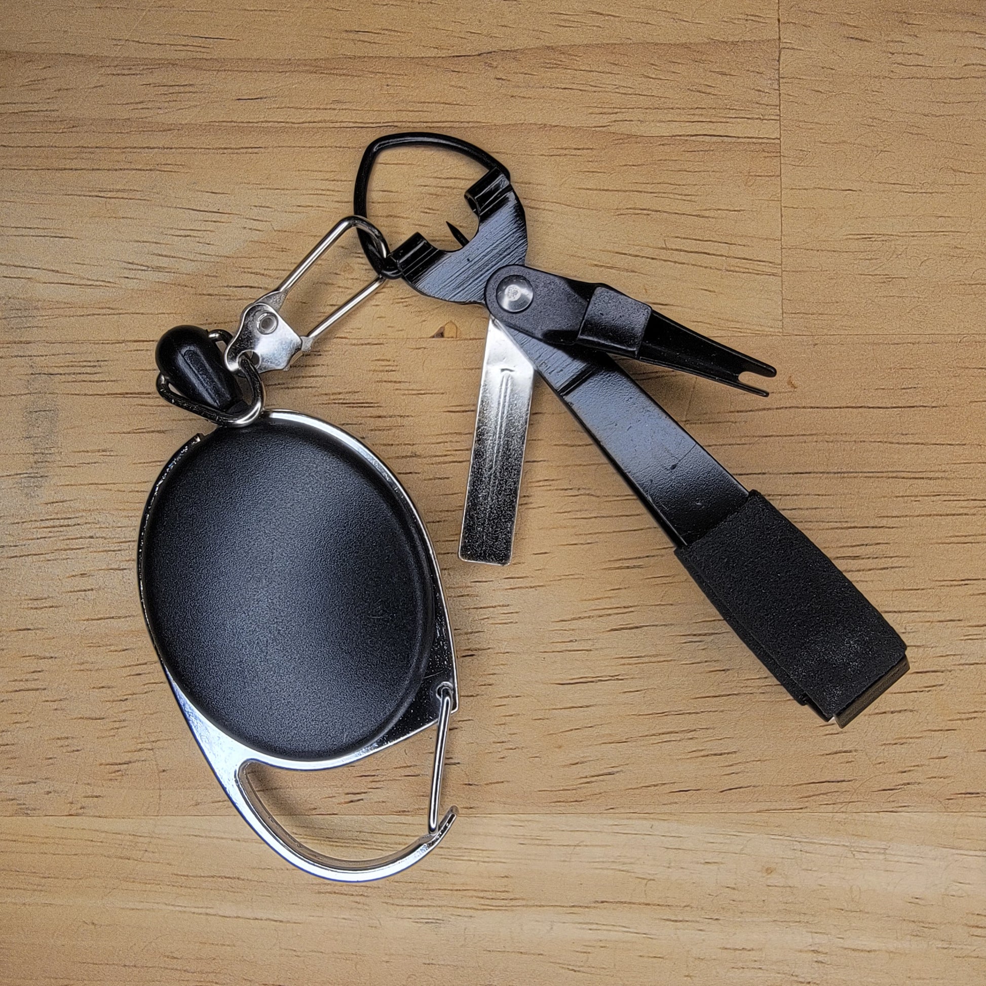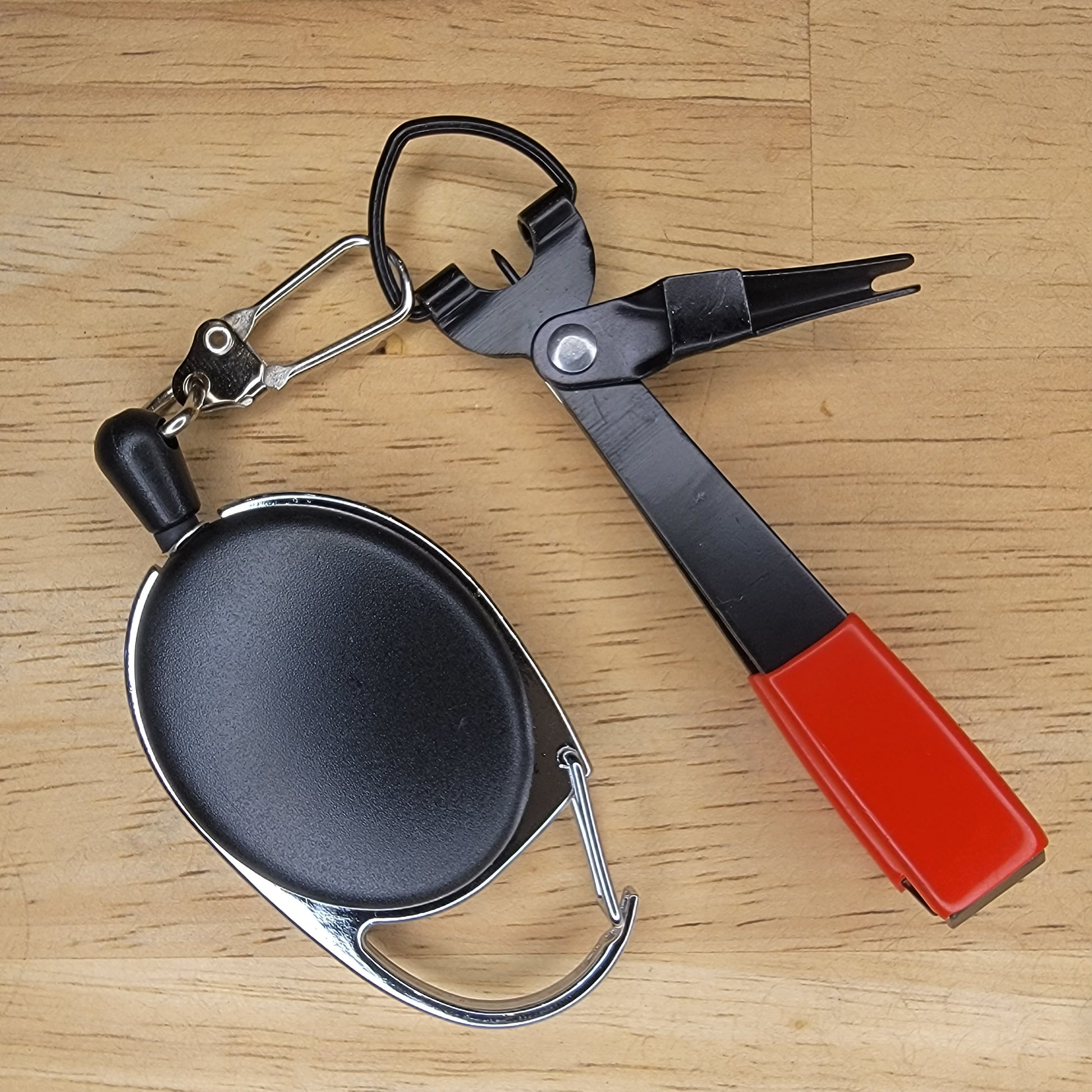 Small Tool Retractor with line clipper, eye opener, knot tyer, and hook file