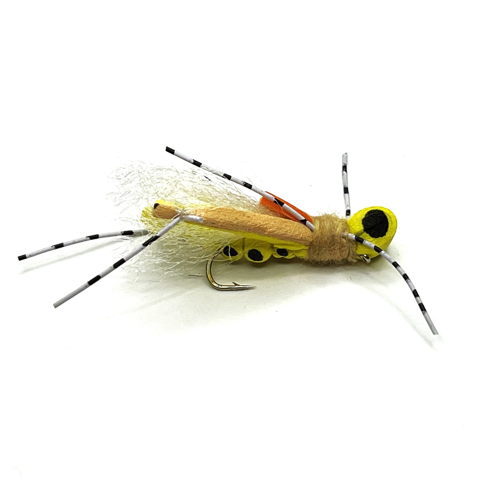 The extra buoyant foam body suspends temptingly on the surface. It imitates vulnerable grasshoppers that trout love to eat. The hand tied foam is durable yet lively.