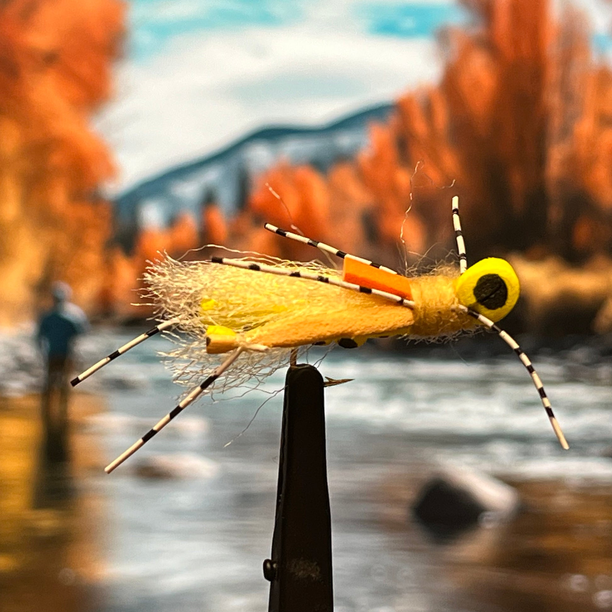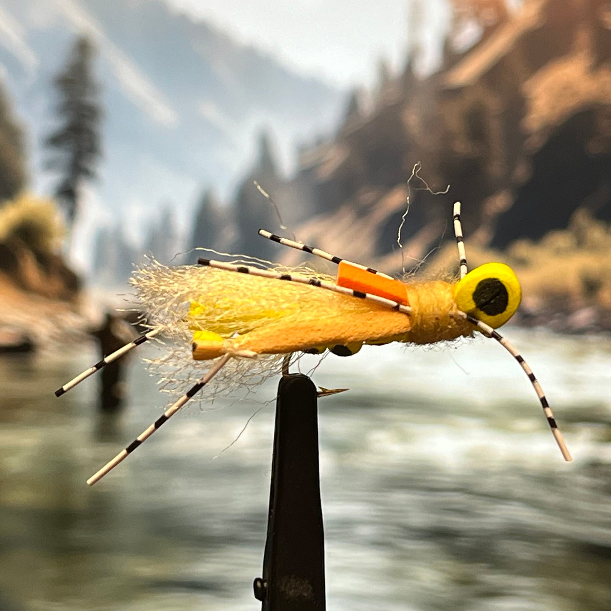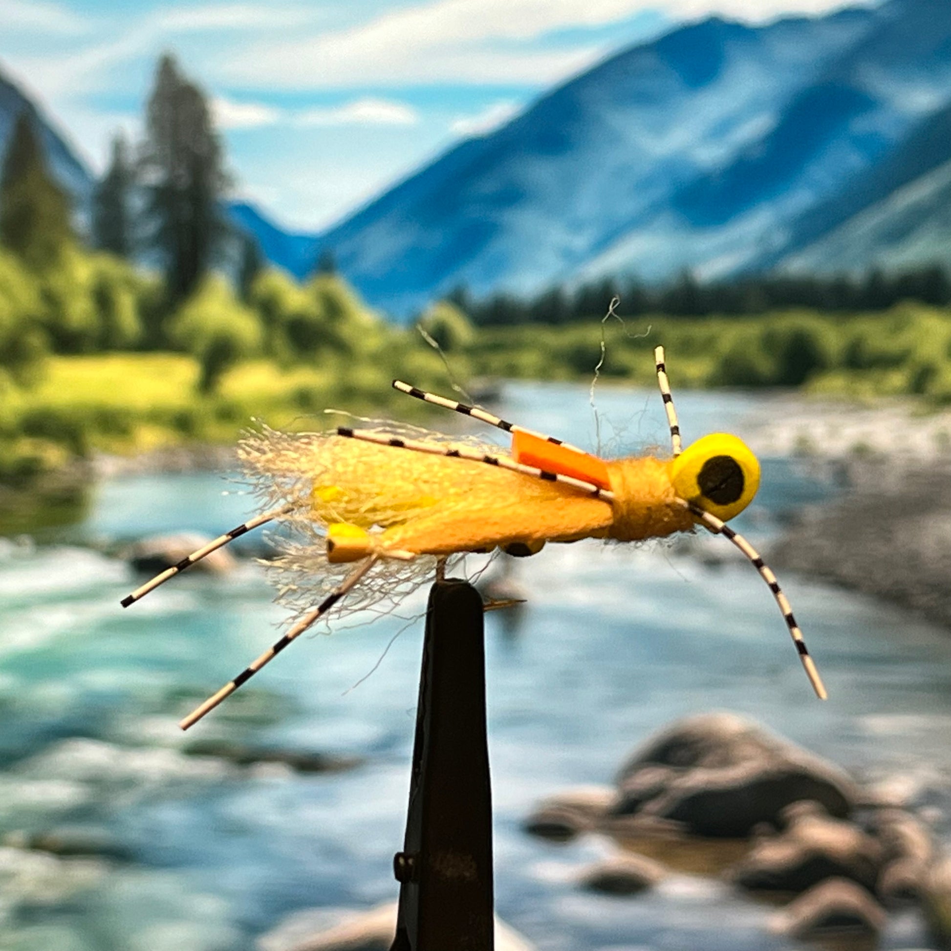The yellow or tan colors match common hopper patterns. The stout foam legs kick realistically in the current. Segmented rubber legs add enticing motion.