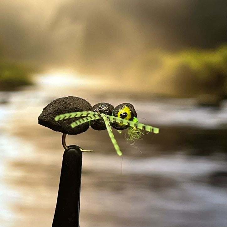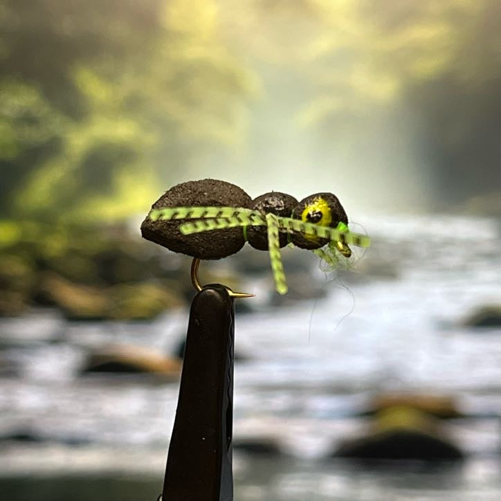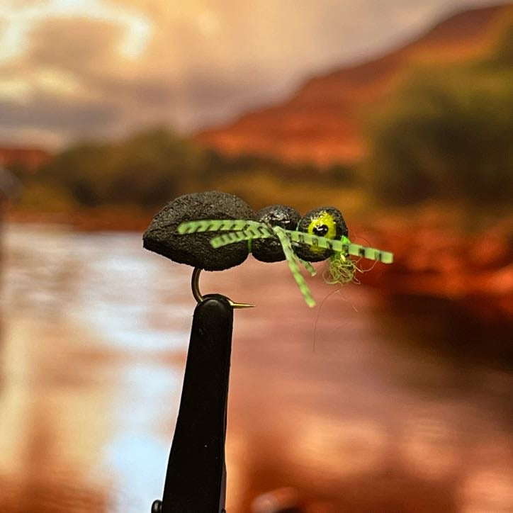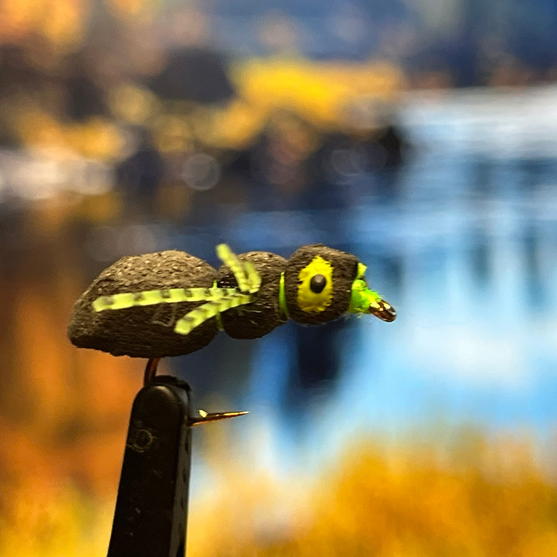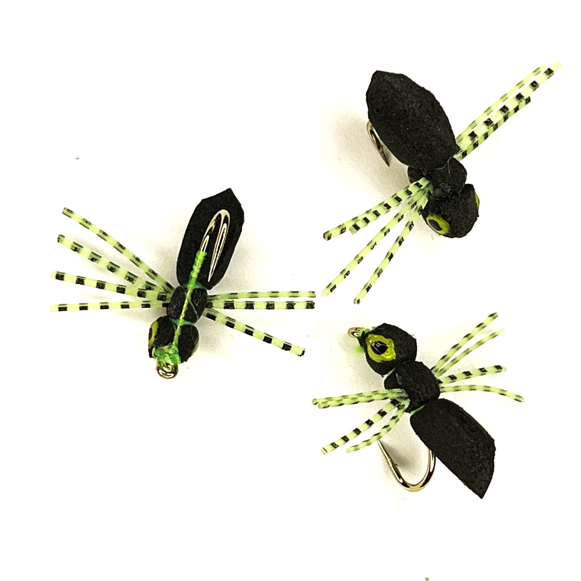 The buoyant foam body suspends temptingly on the water's surface. Segmented rubber legs move seductively in the current, mimicking a juicy terrestrial spider.